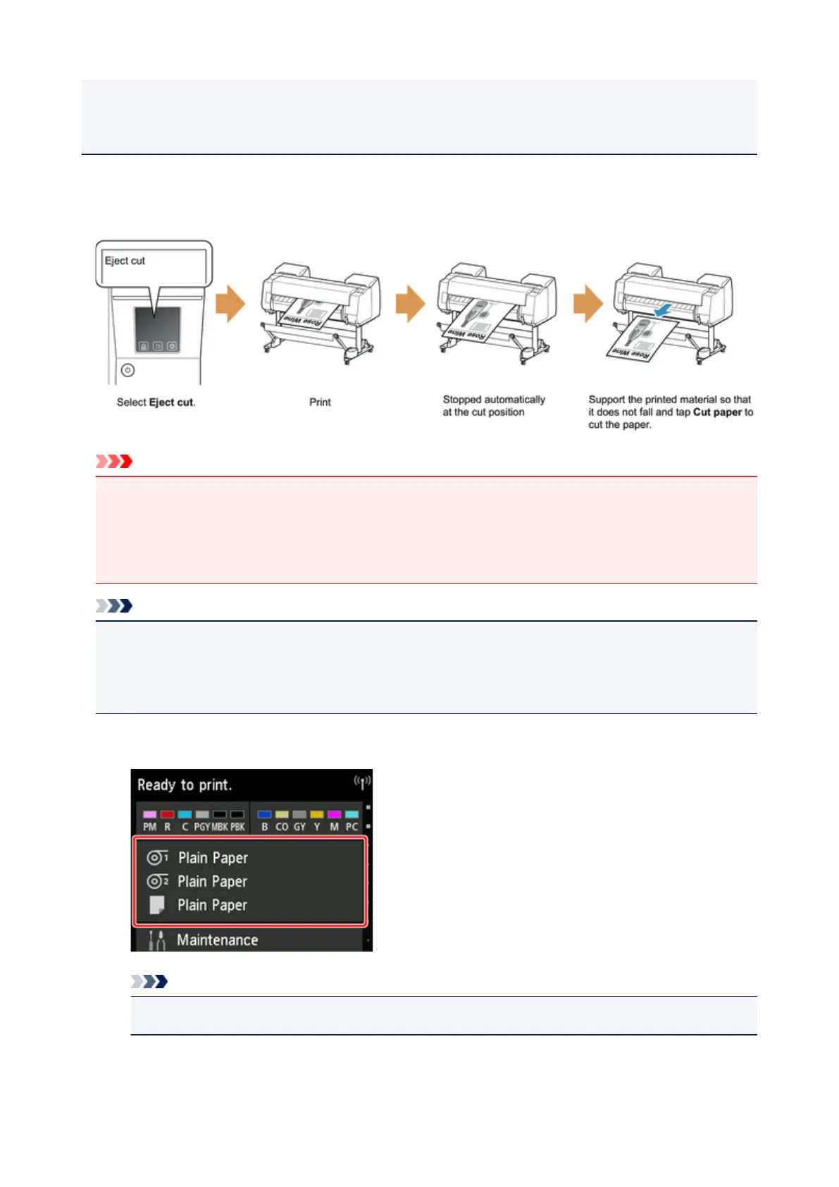 • When cutting wide printed documents after ejection, have two people support the documents. If the