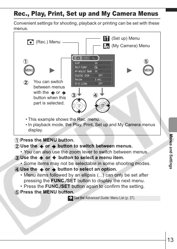 Rec., Play, Print, Set up and My Camera Menus