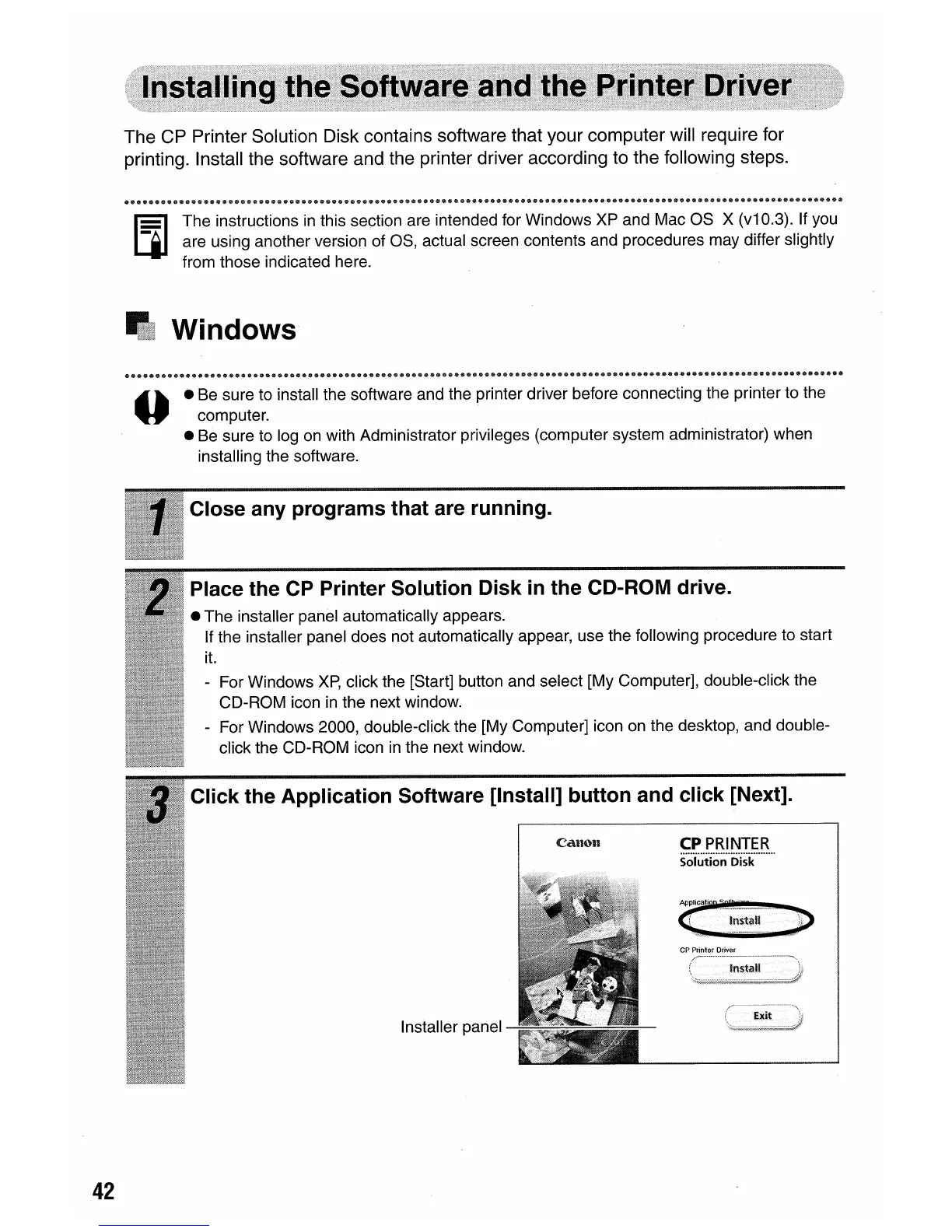 • Be sure to install the software and the printer driver before connecting the printer to the