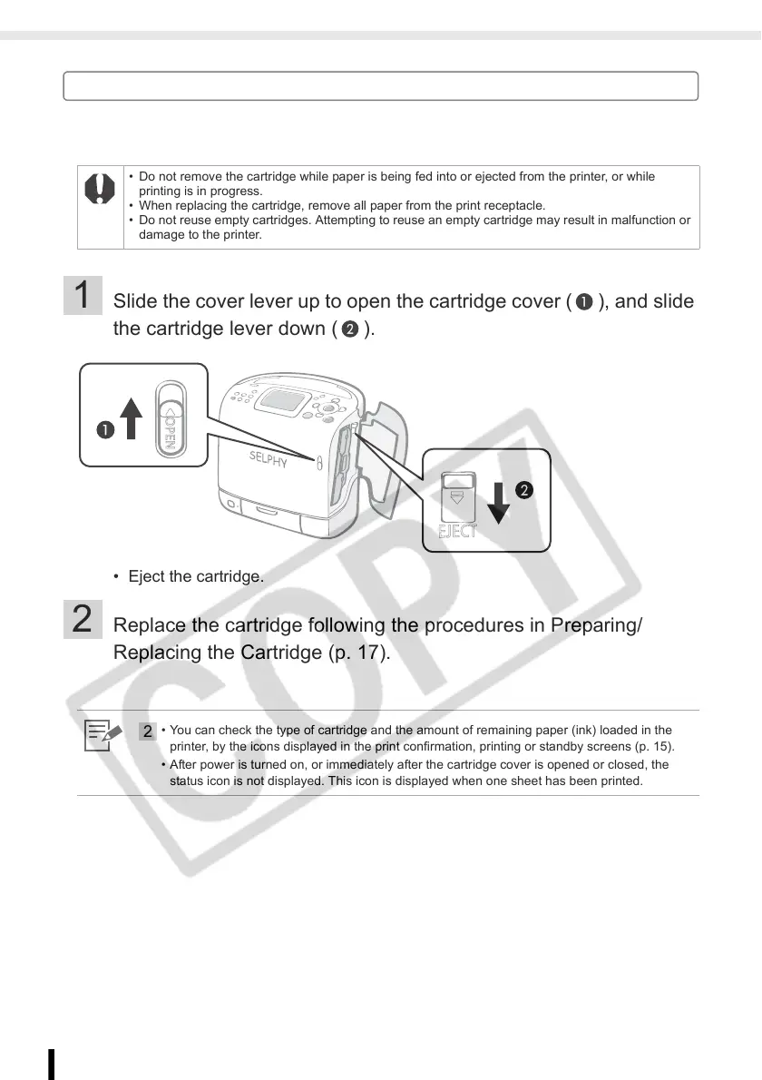 1 Slide the cover lever up to open the cartridge cover ( ), and slide
