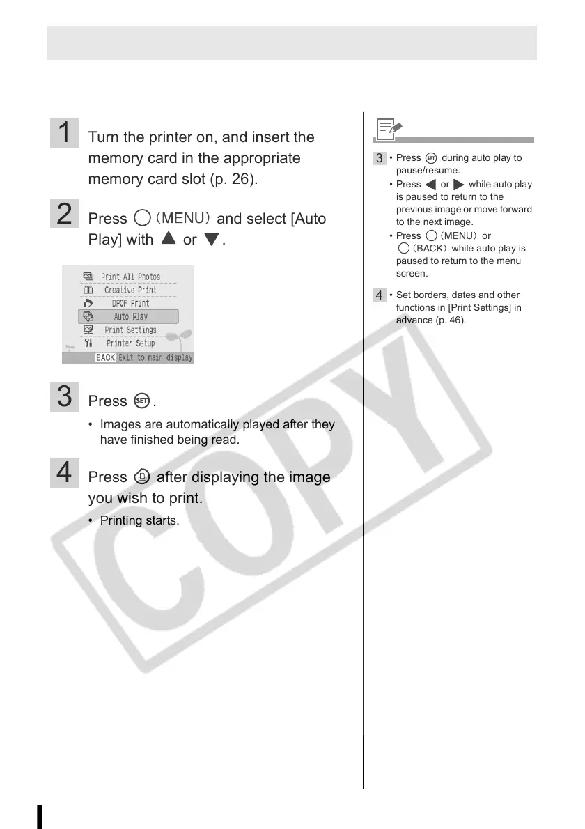 All images on the memory card are automatically played back and an image can be printed by