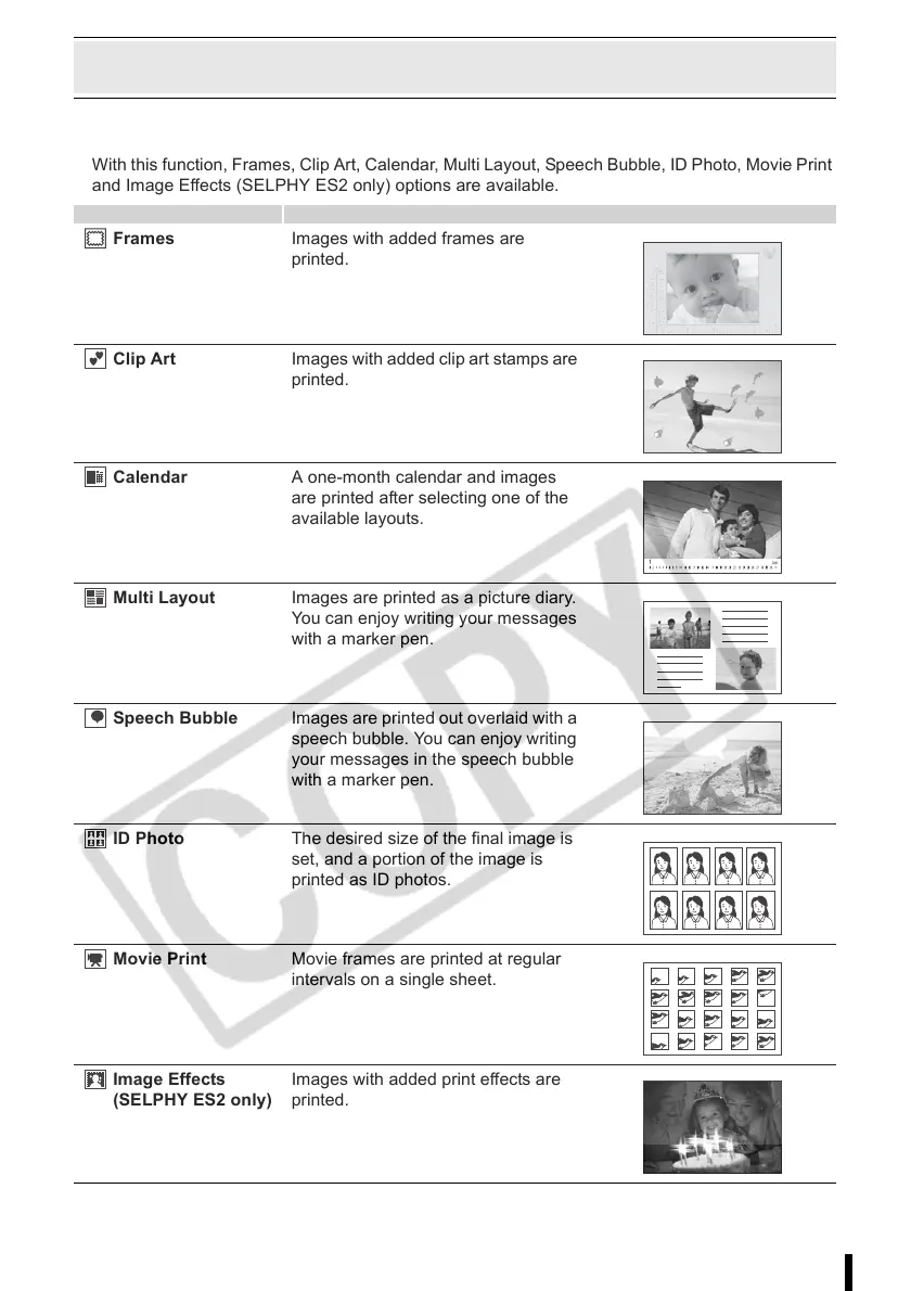 With this function, Frames, Clip Art, Calendar, Multi Layout, Speech Bubble, ID Photo, Movie Print