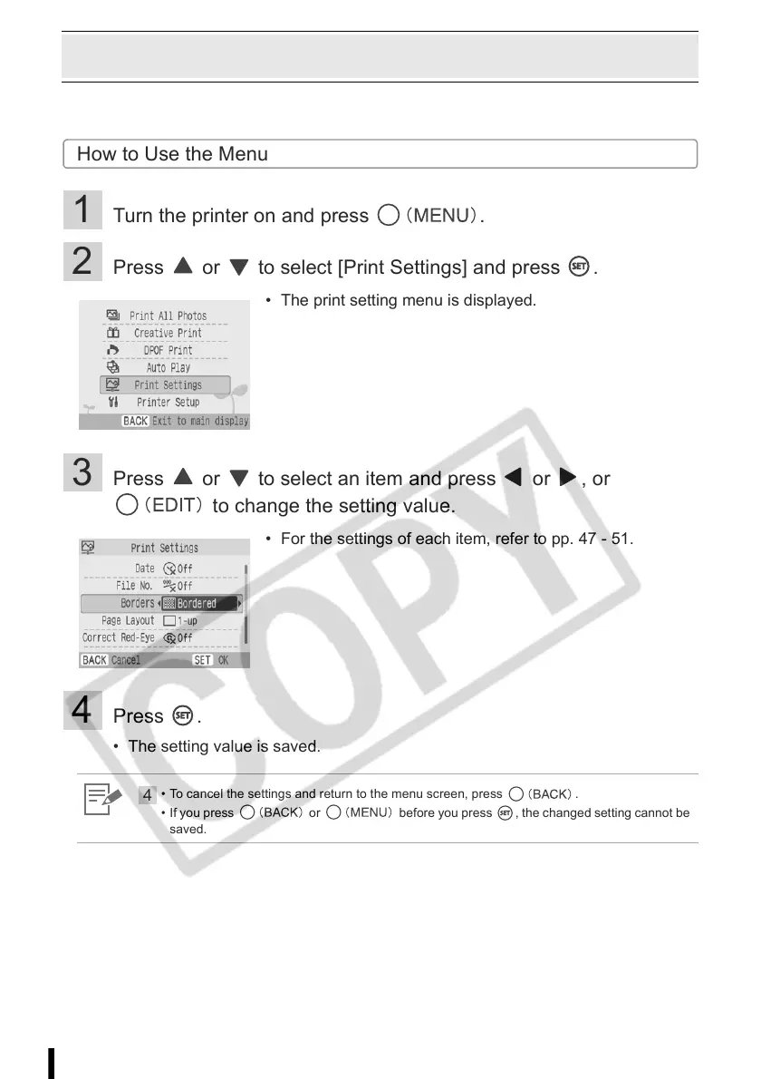 You can set print-related items, such as date on or off, border or borderless, print layout.
