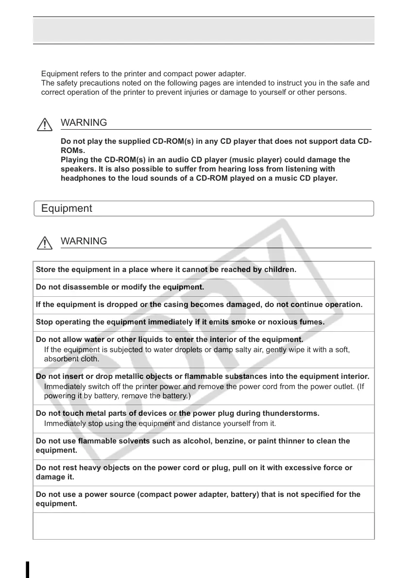 Use this equipment correctly according to the following precautions to avoid the risk of injury, fire,