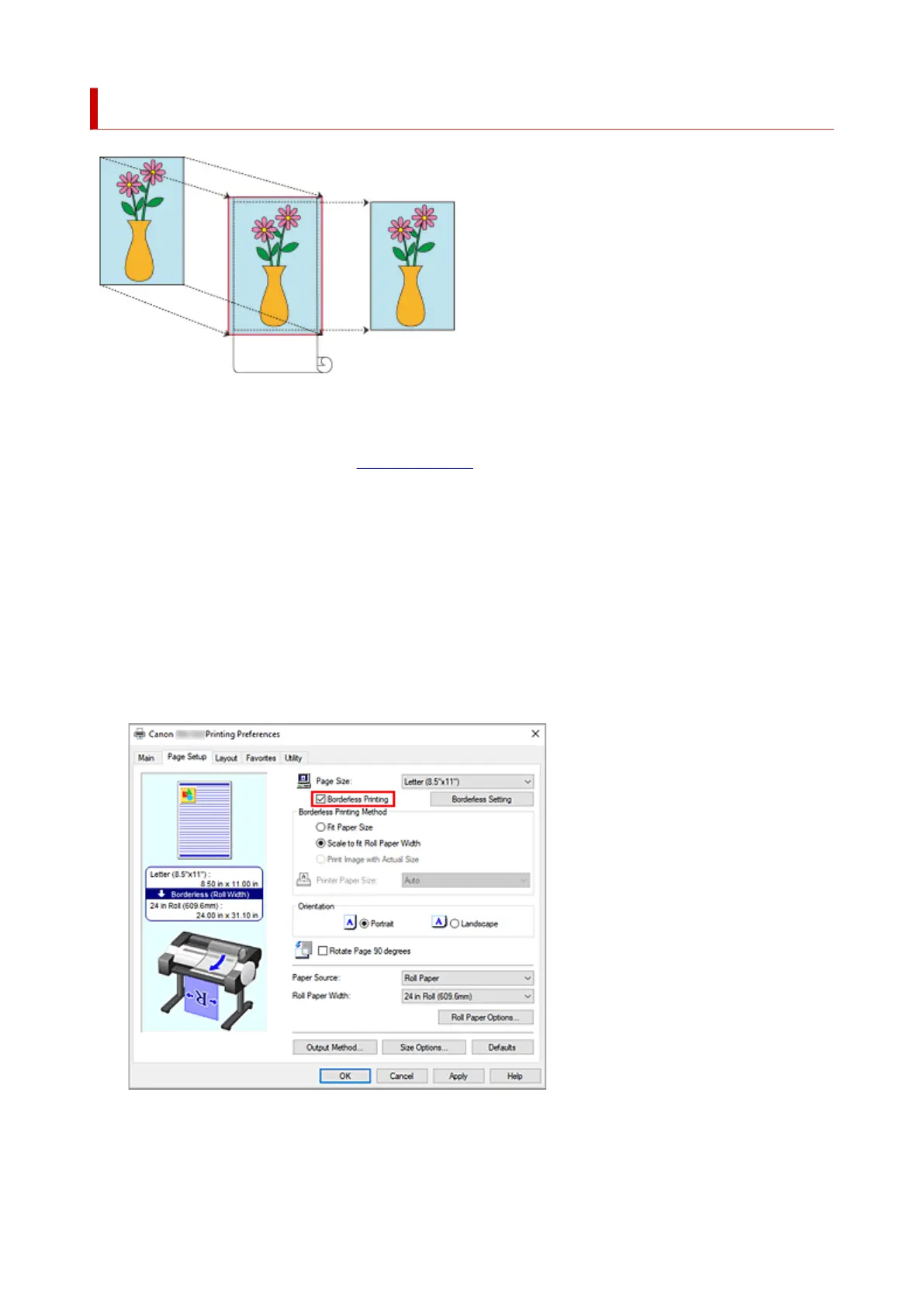 Procedure for printing borderless by enlarging/reducing documents to match roll paper width.