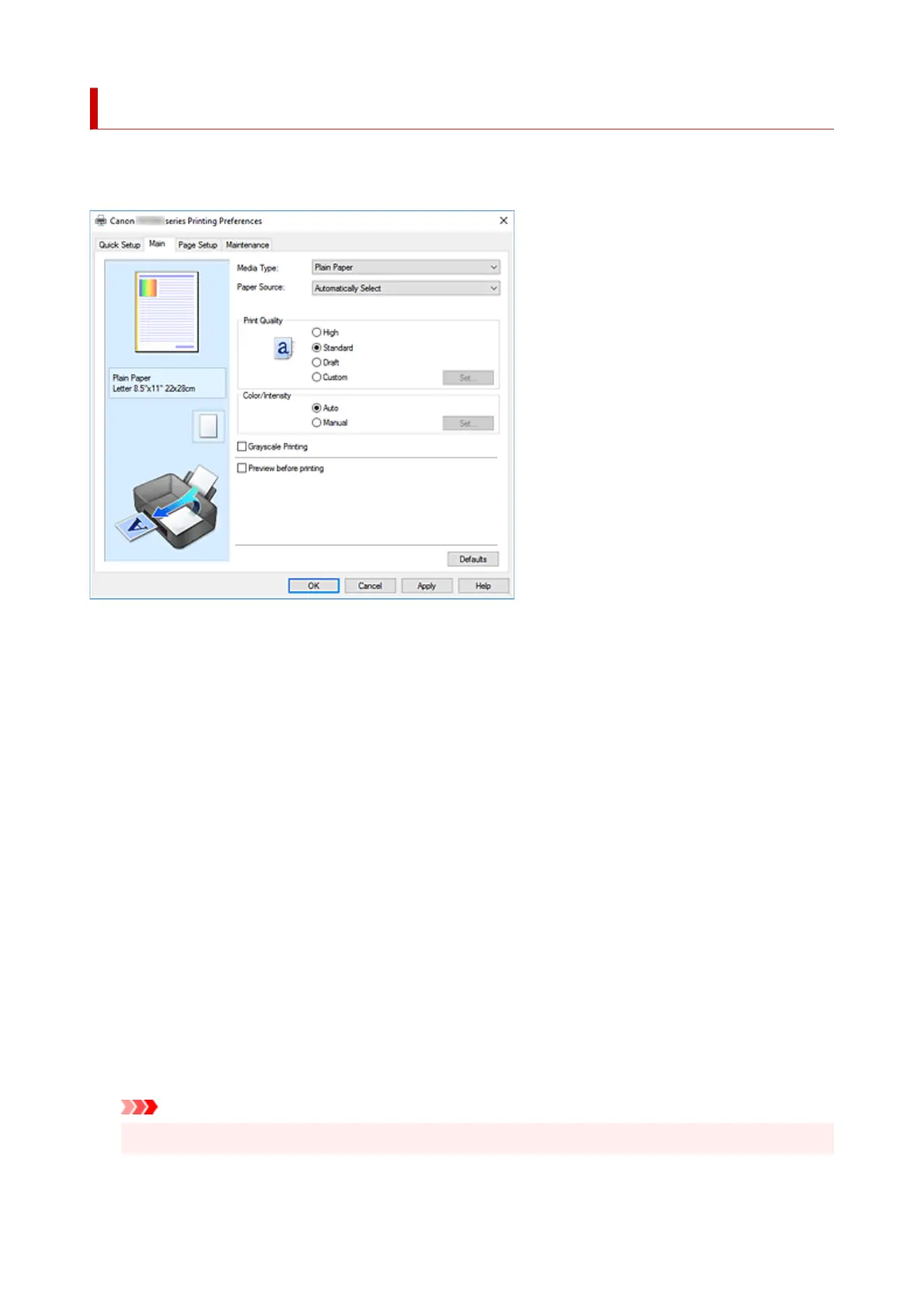 The Main tab allows you to create a basic print setup in accordance with the media type. Unless special
