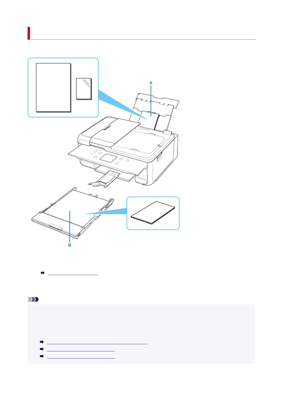 The printer has two paper sources for feeding paper, the rear tray (A) and cassette (B).
