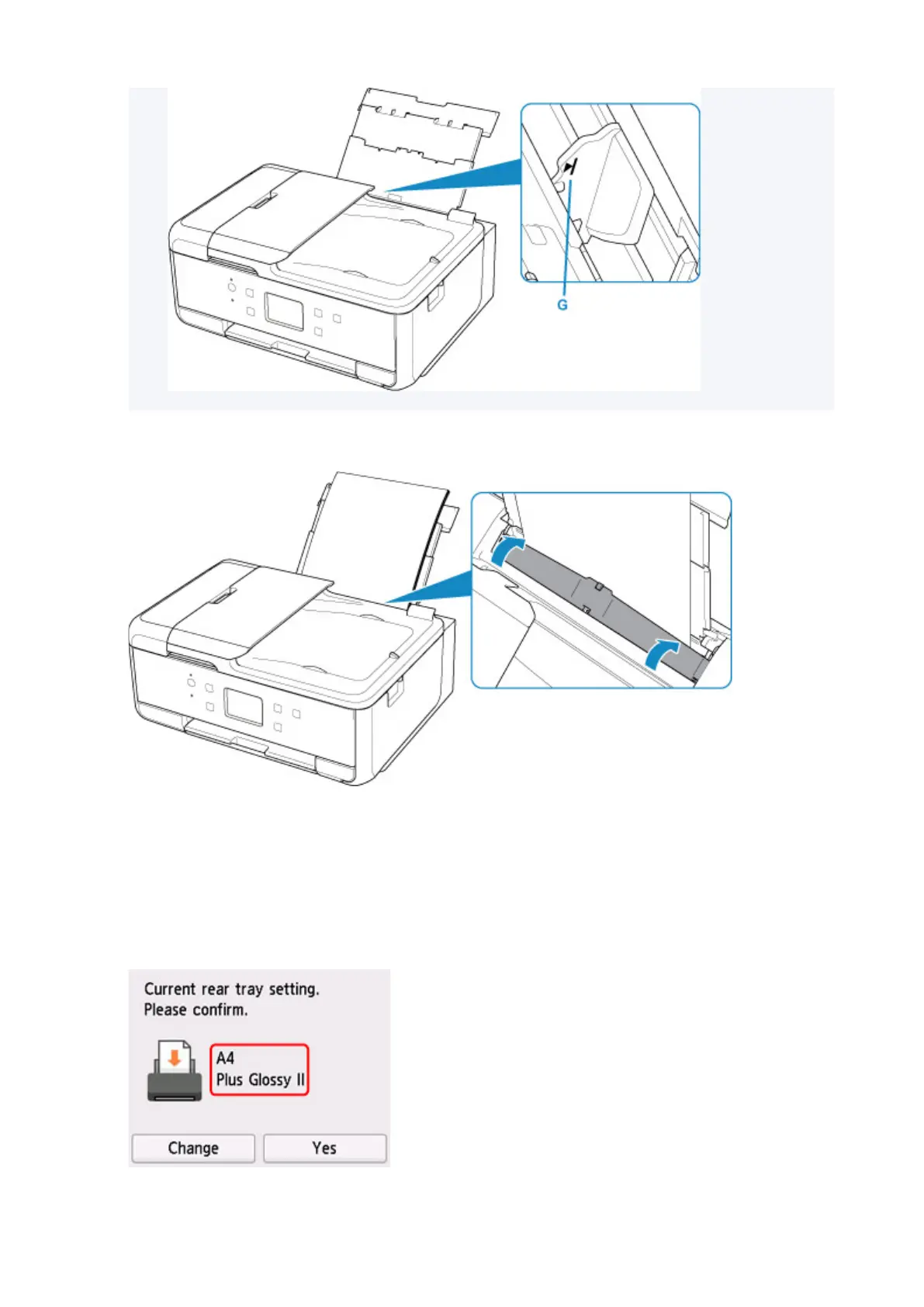 After closing the feed slot cover, the paper setting confirmation screen for the rear tray appears on the