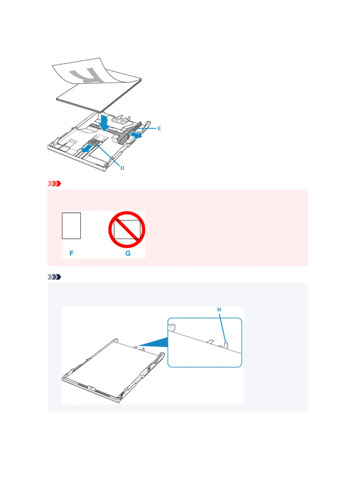 • Always load paper in portrait orientation (F). Loading paper in landscape orientation (G) can