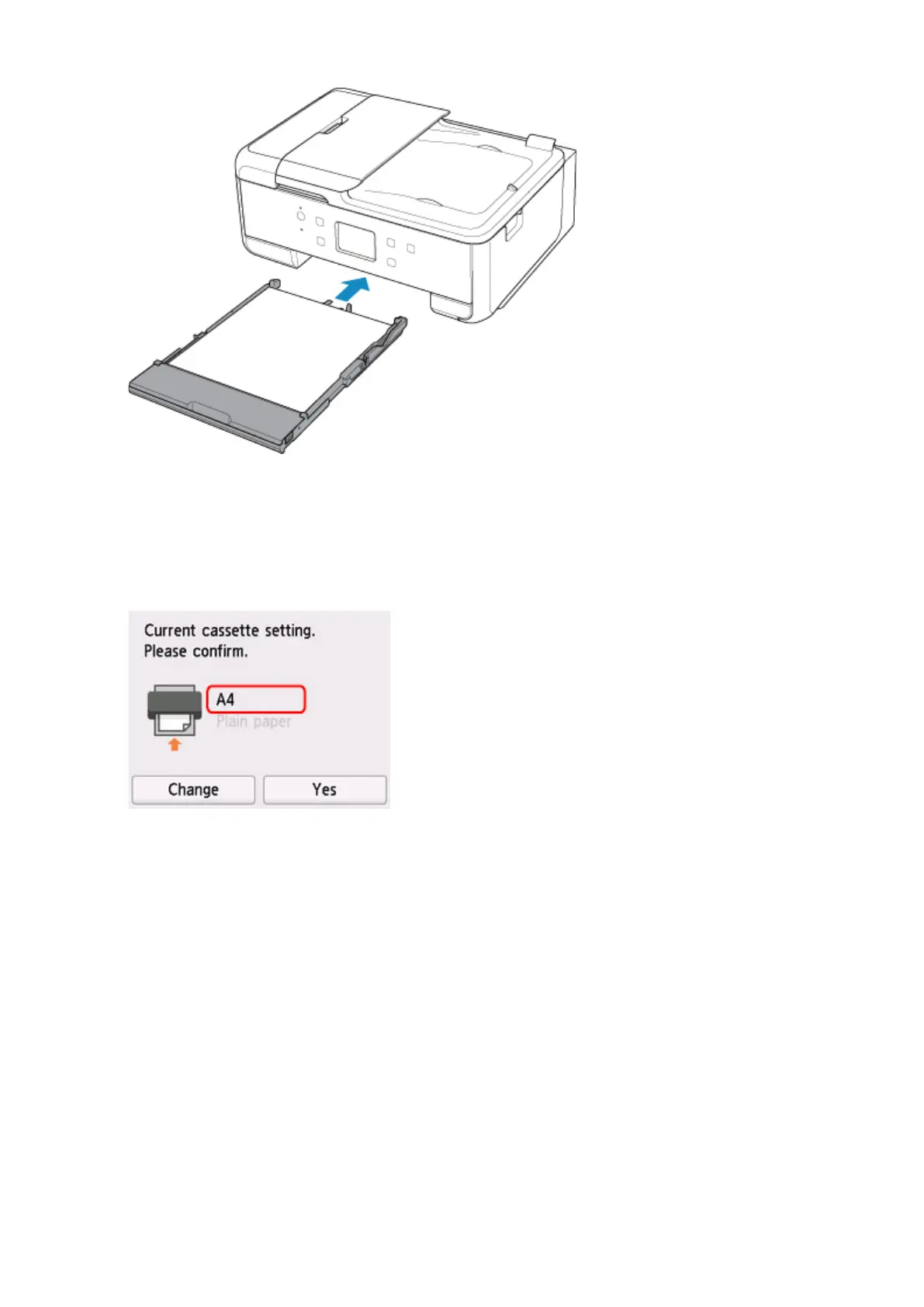 After inserting the cassette into the printer, the paper setting confirmation screen for the cassette