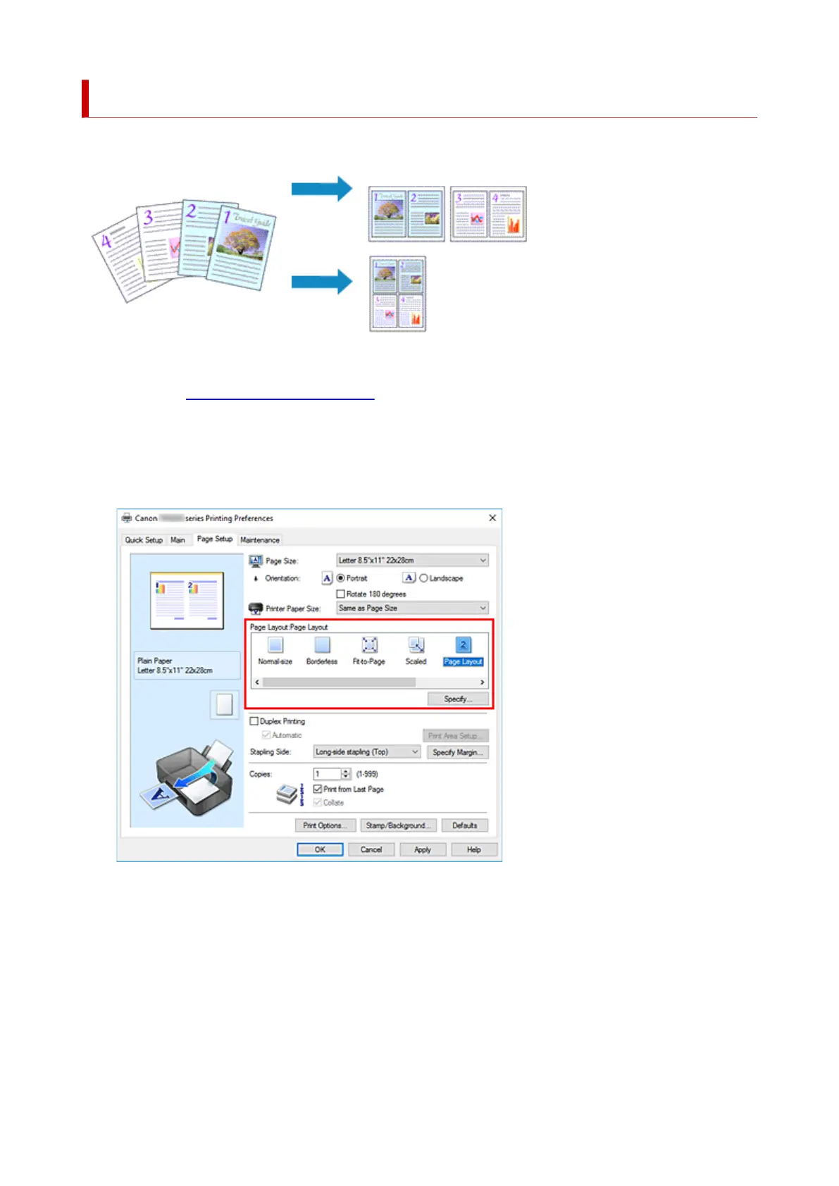 The page layout printing function allows you to print more than one page image on a single sheet of paper.