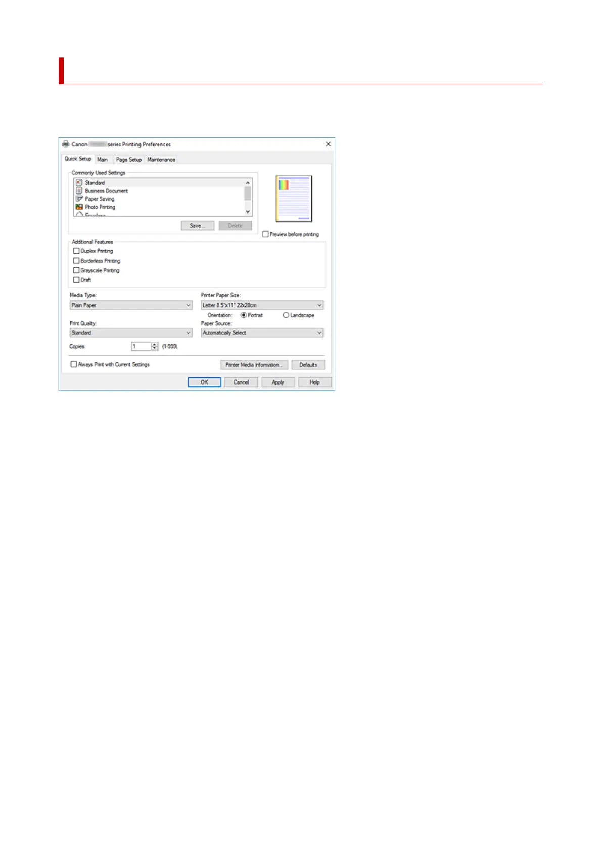 The Quick Setup tab is for registering commonly used print settings. When you select a registered setting,