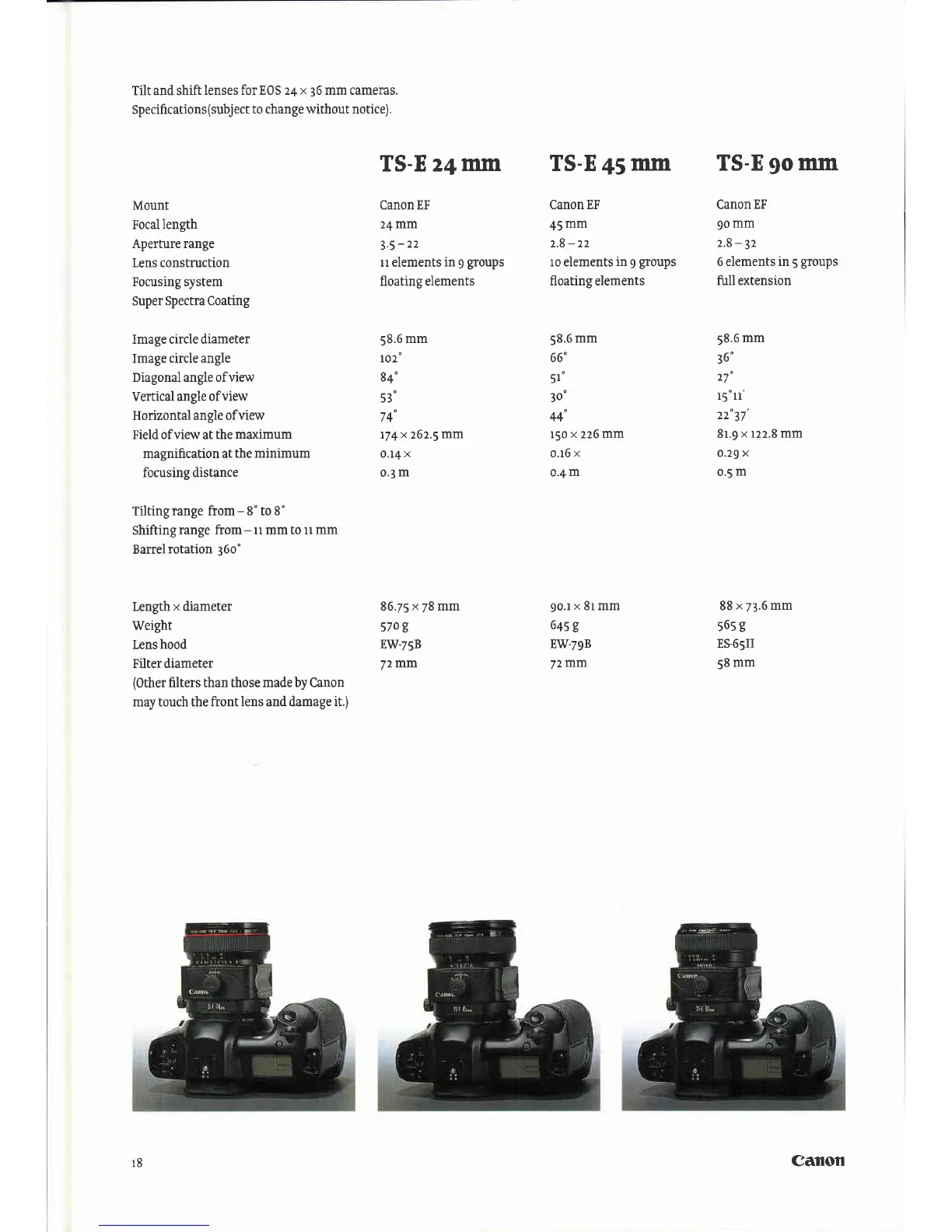 Canon TS E - Tilt and shift lenses for EOS 24 × 36 mm cameras.; TS-E 24 mm Specifications; TS-E 45 mm Specifications; TS-E 90 mm Specifications
