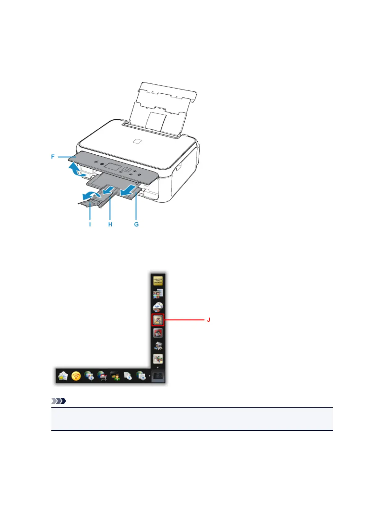 (H), and open the output tray extension (I).