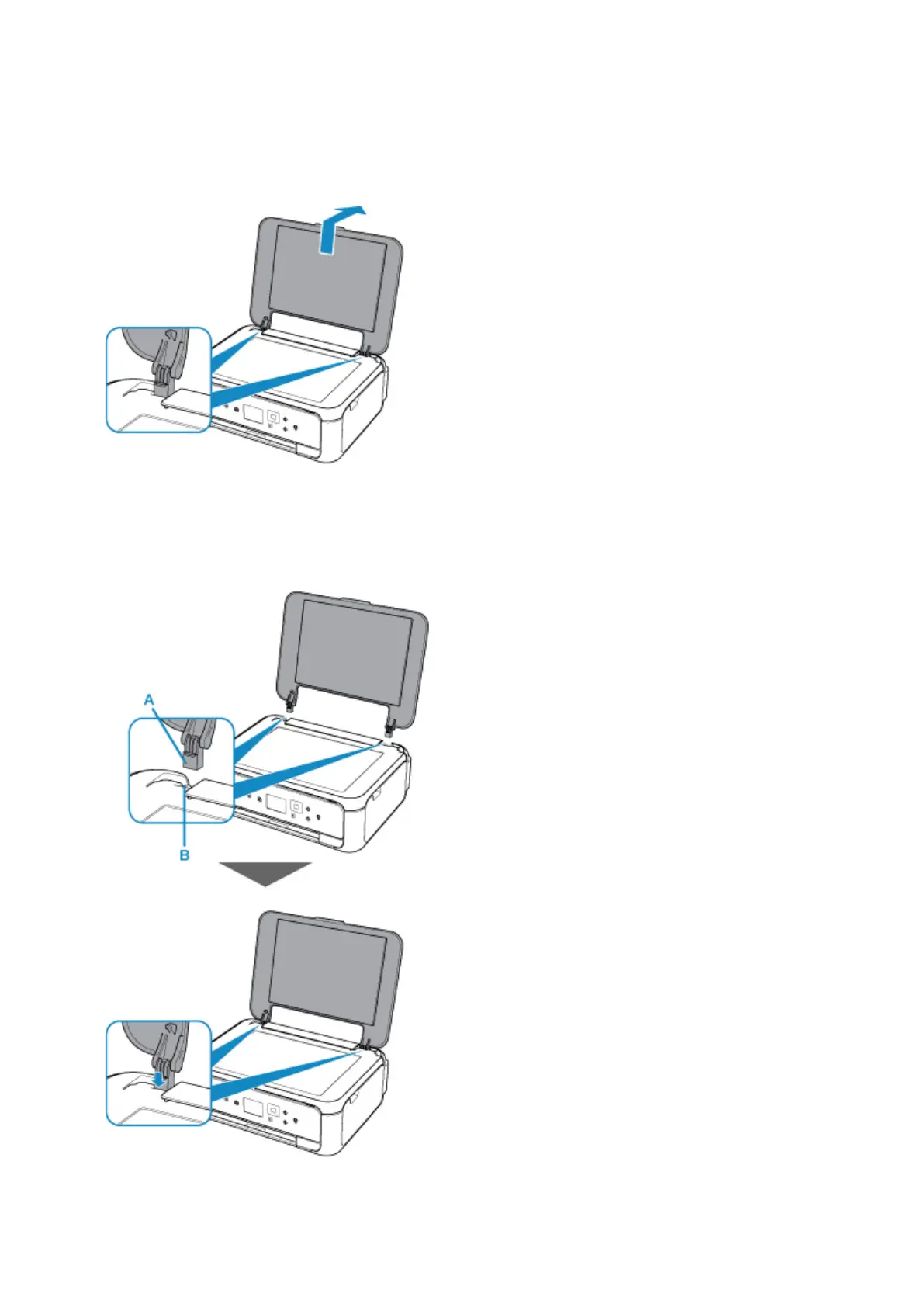 Fit both hinges (A) of the document cover into the holder (B) and insert both hinges of the document cover
