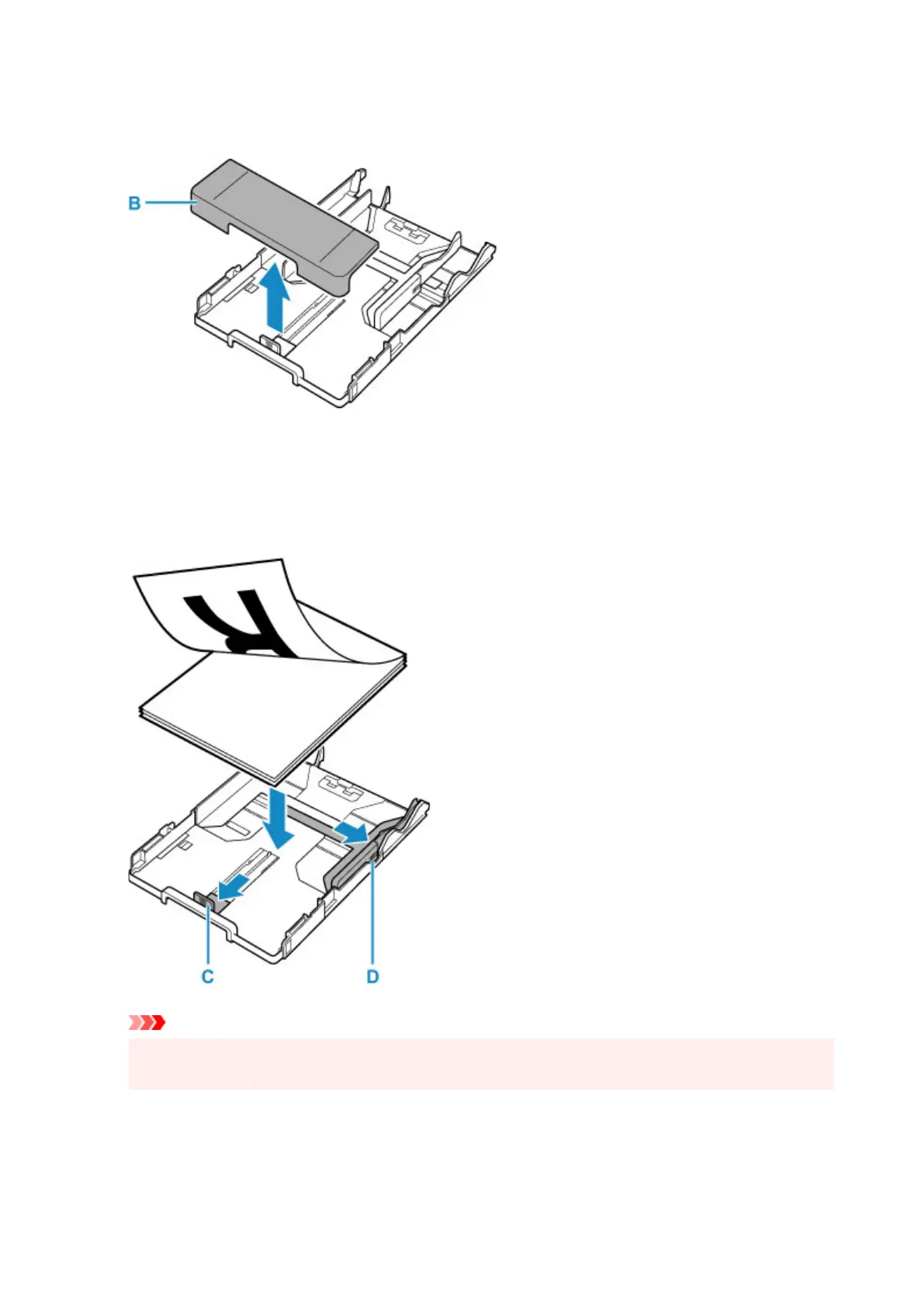 Always load paper in portrait orientation (E). Loading paper in landscape orientation (F) can cause