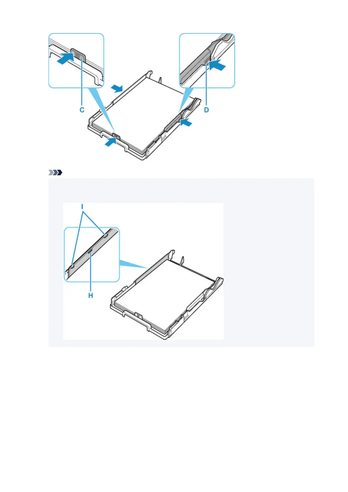 • Keep the paper stack height below the tabs (I) of the paper guides.