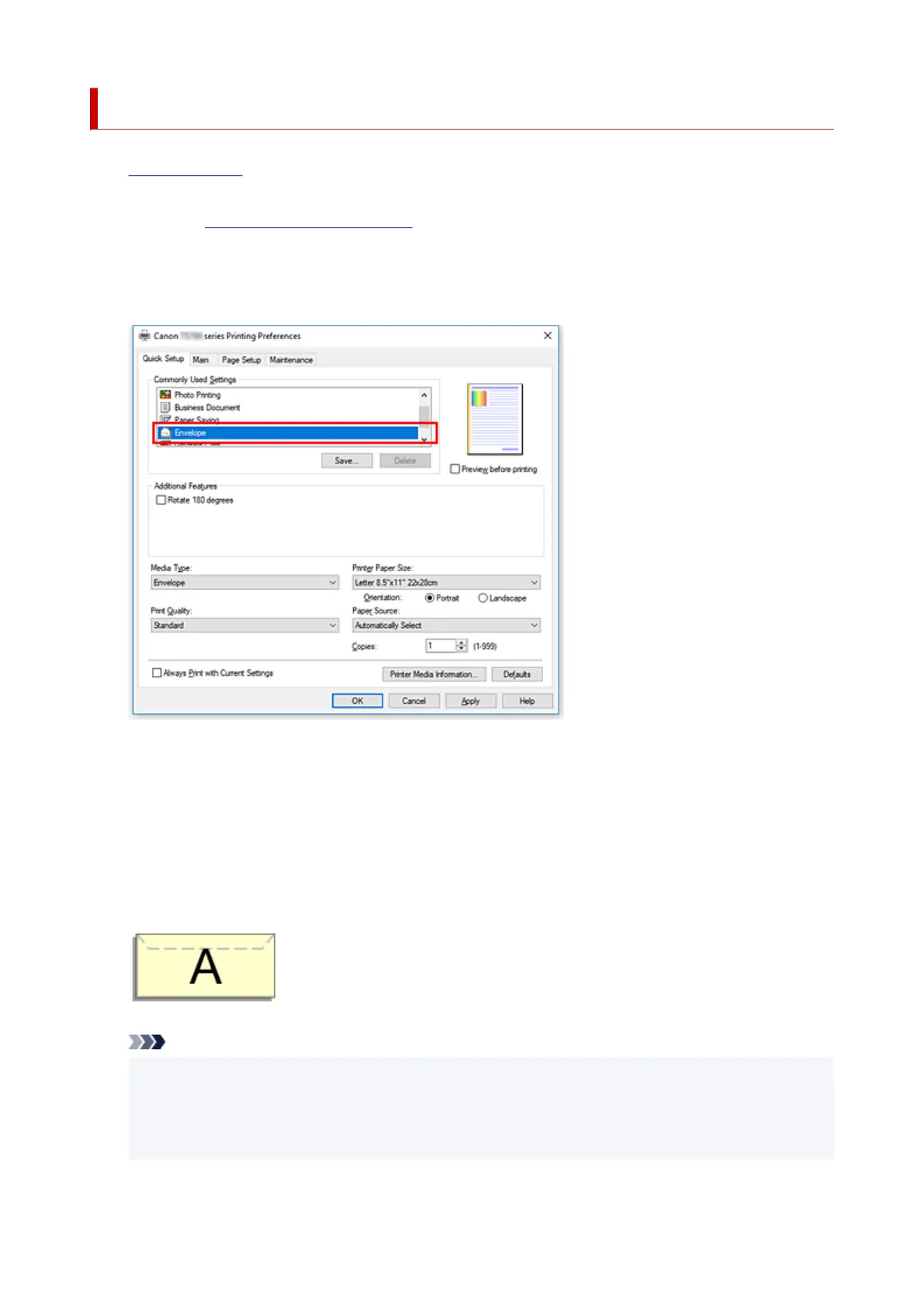 When the Envelope Size Setting dialog box is displayed, select Envelope Com 10, Envelope DL,