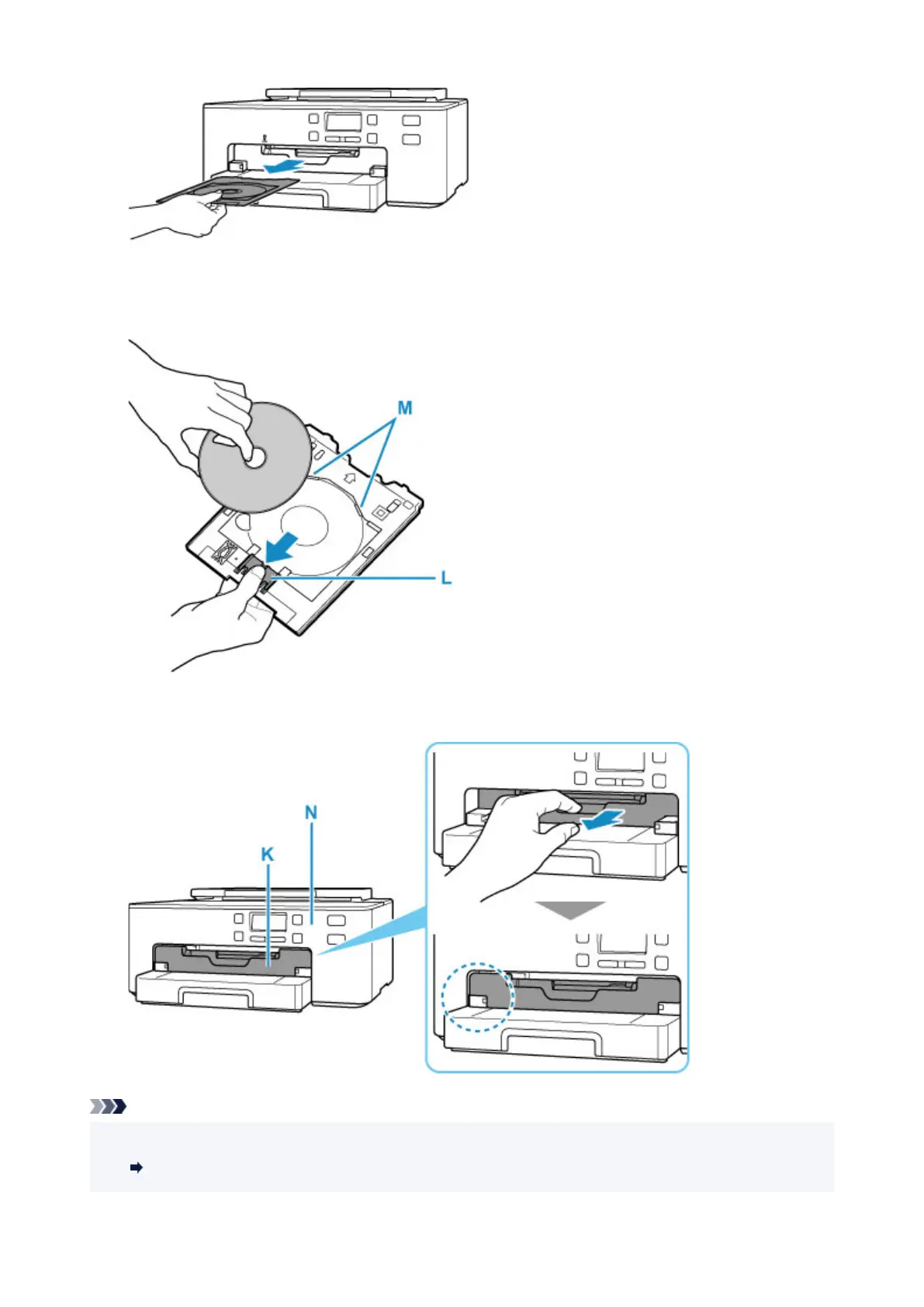 17. While pressing down lock (L), take out printable disc from slits (M) on multi-purpose tray,