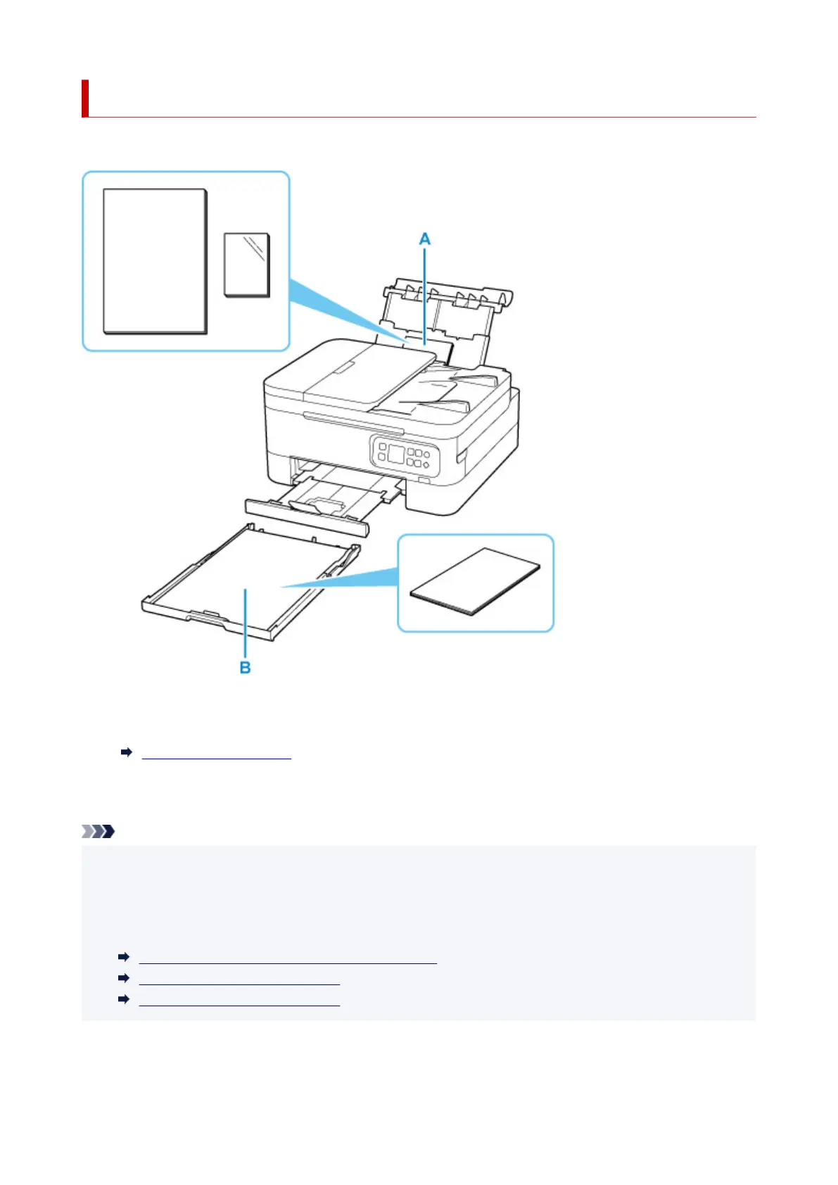 The printer has two paper sources for feeding paper, the rear tray (A) and cassette (B).