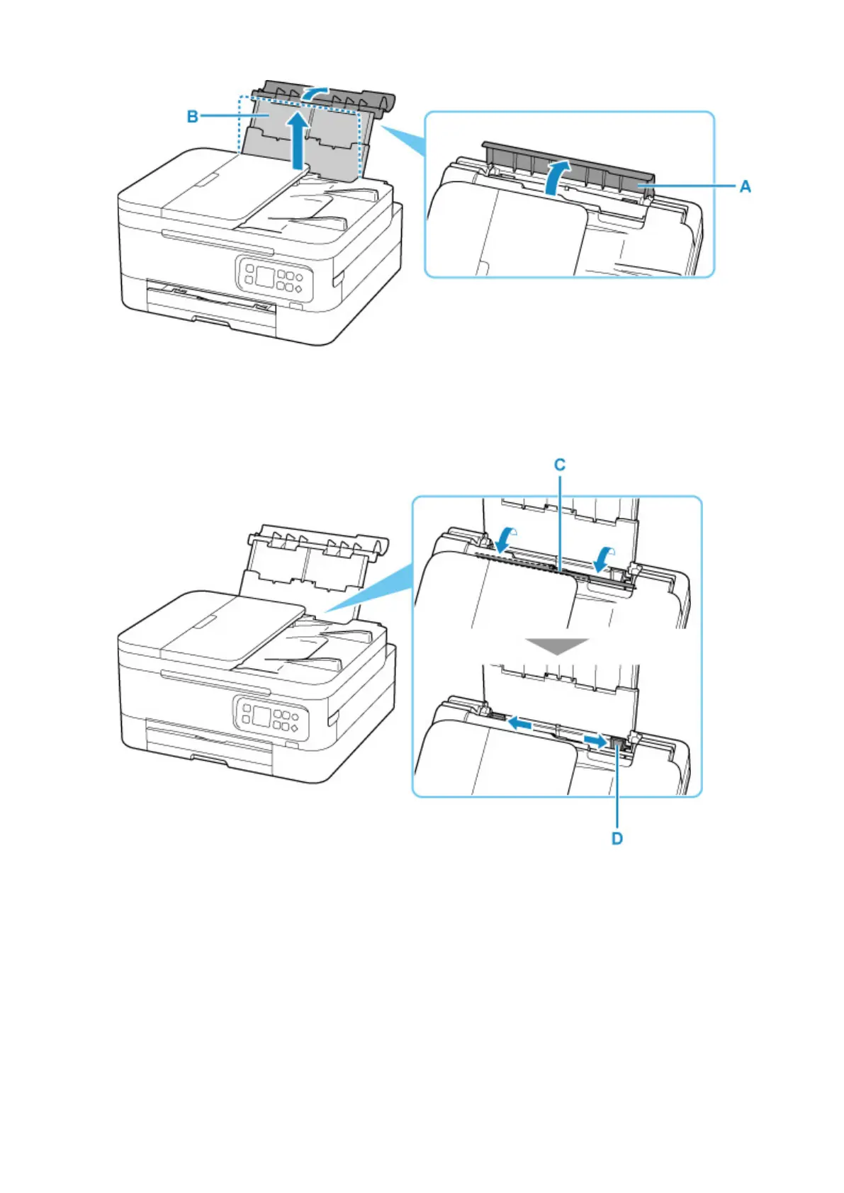 Slide right paper guide (D) to open both paper guides.