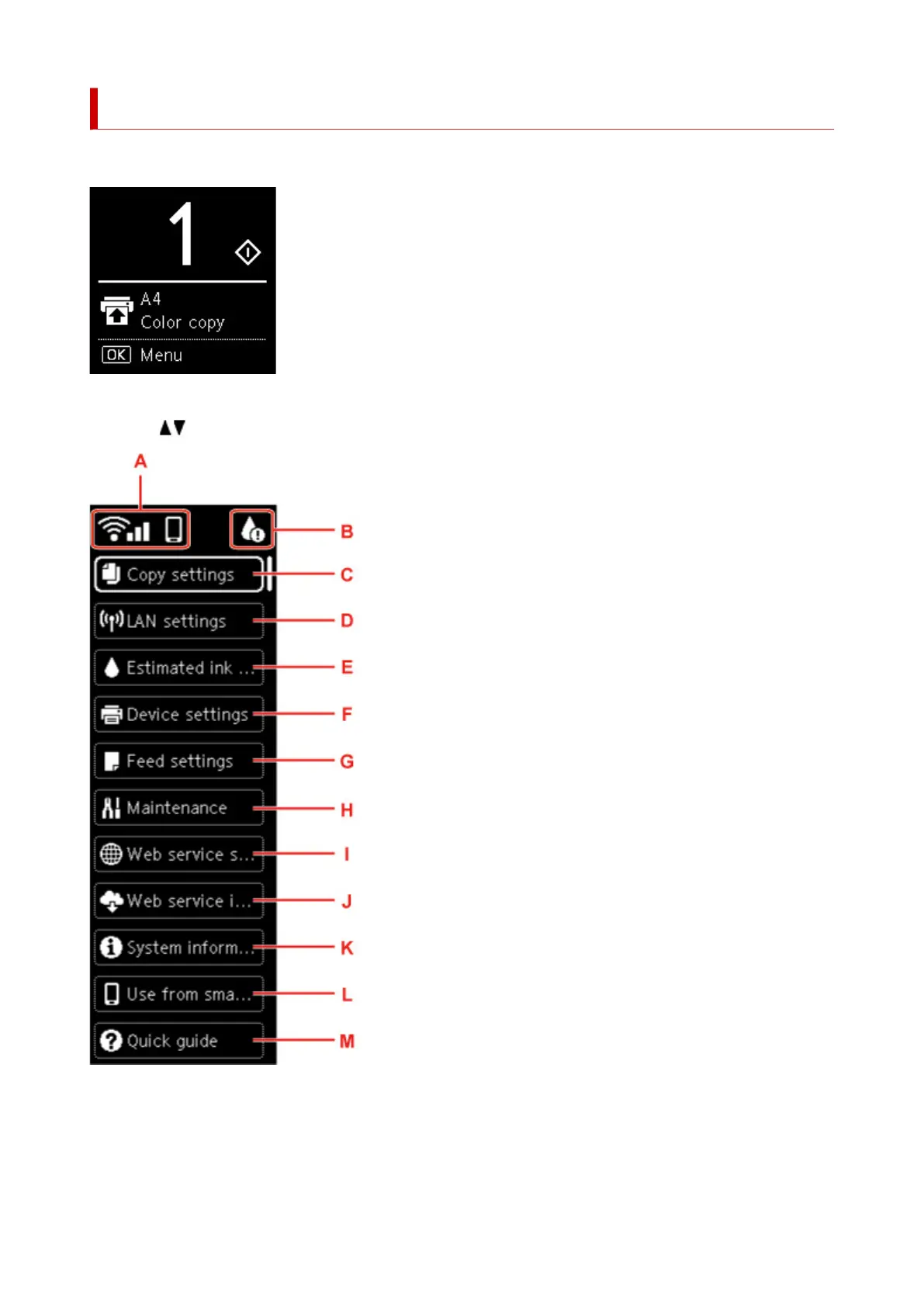 When you press the OK button in the Copy standby screen, the menu screen appears.