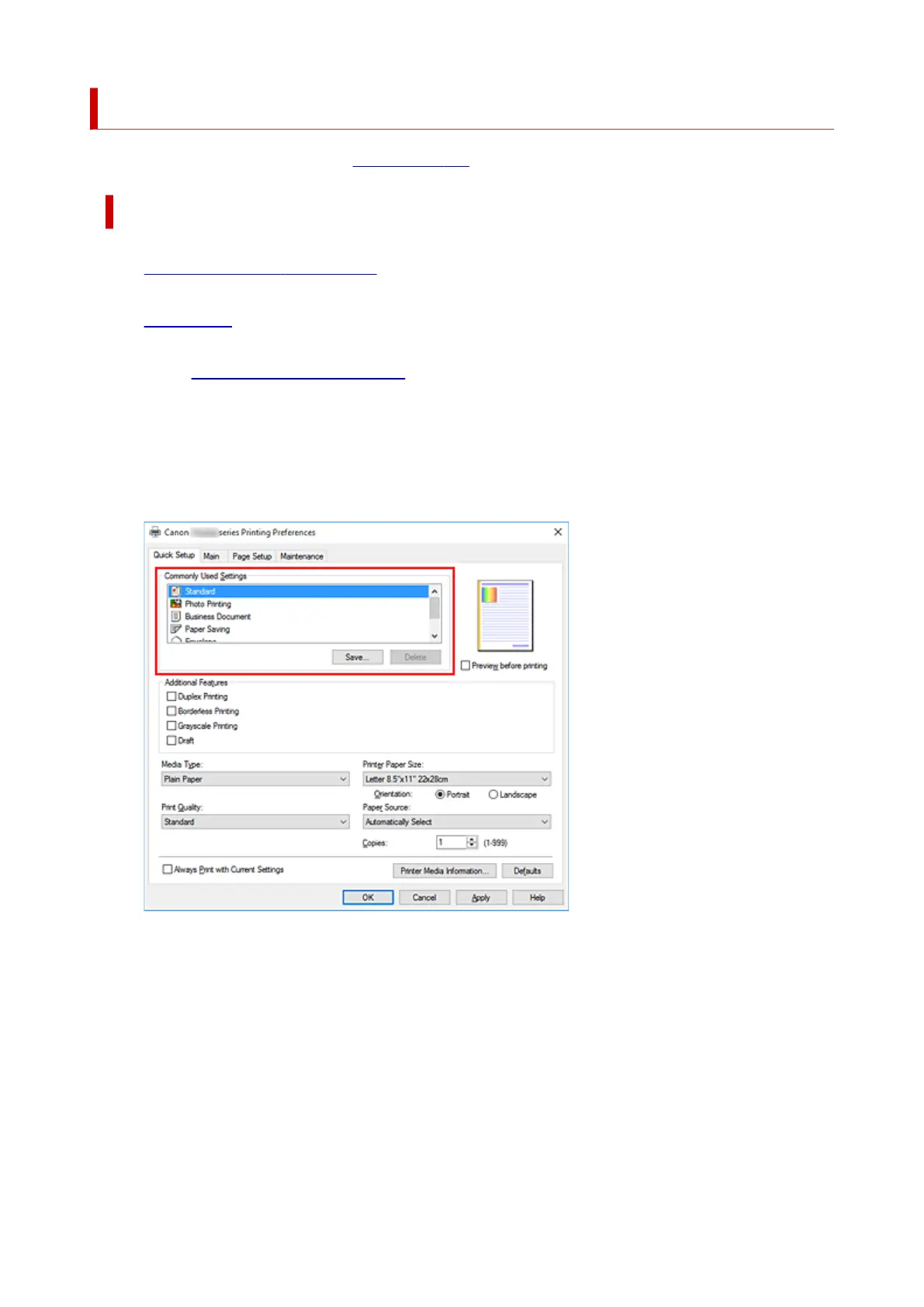 On the Quick Setup tab, use Commonly Used Settings to select from predefined print settings.