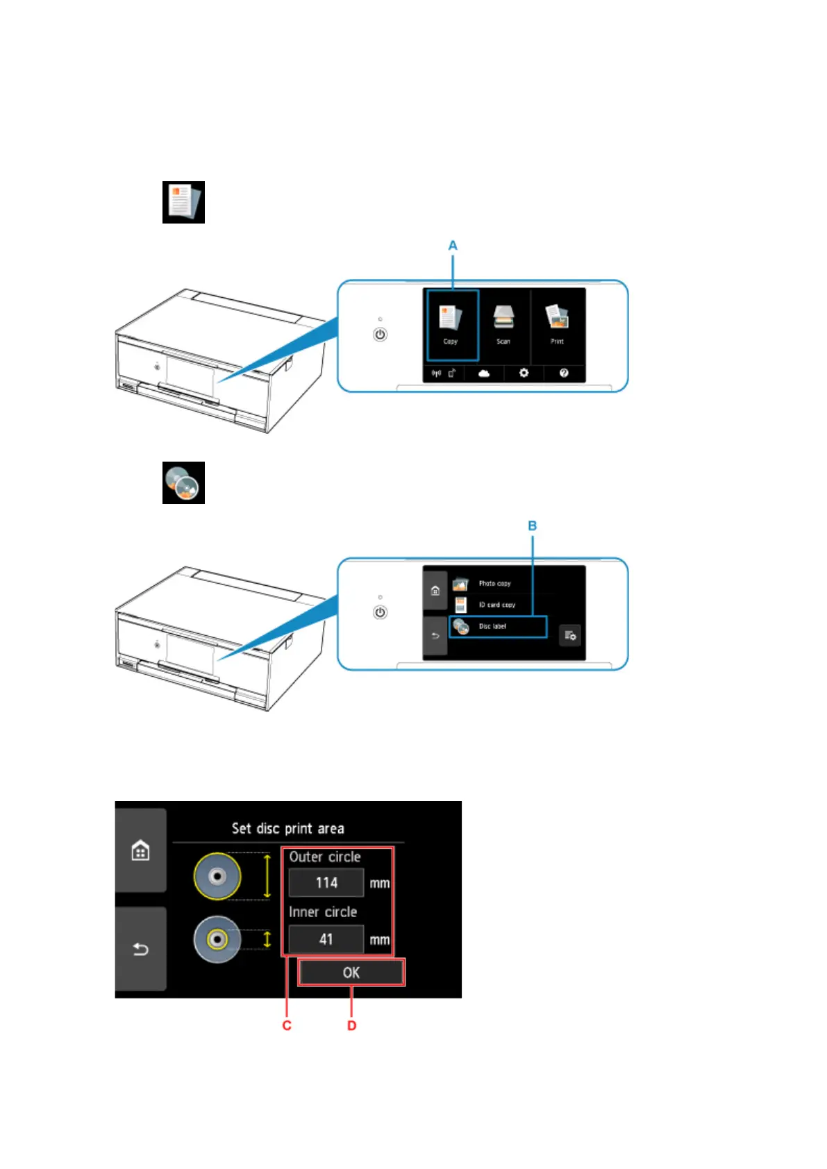 Select Outer circle or Inner circle (C), specify the print area, then select OK (D).