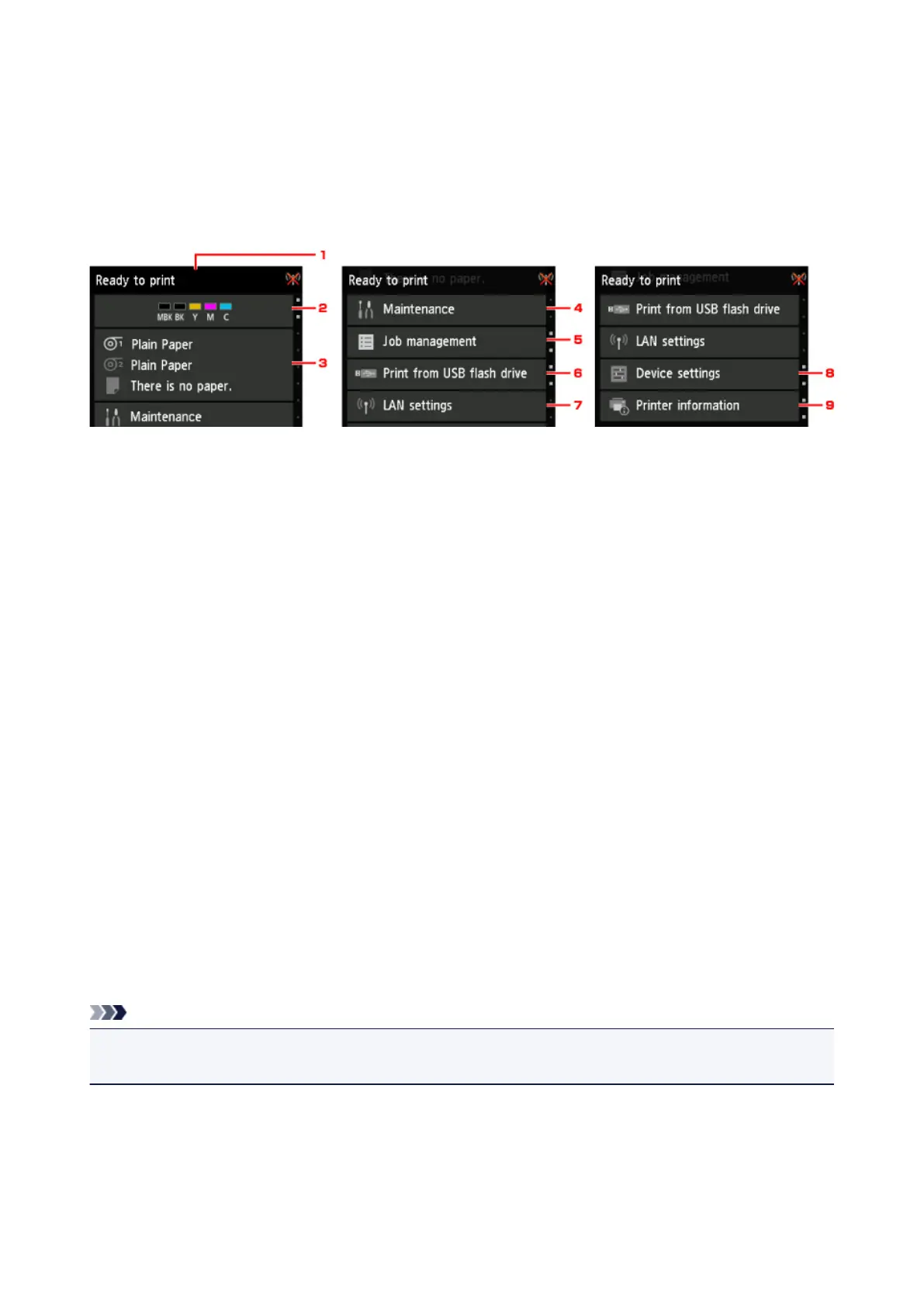 The printer menu is classified into regular menu items available when no print job is in progress and menu