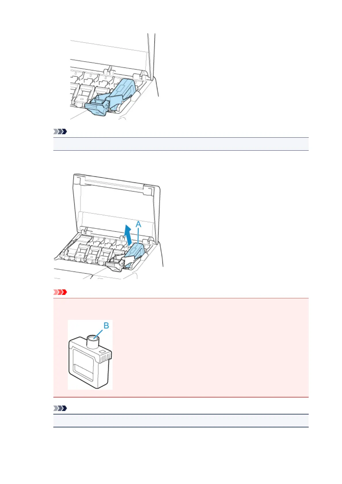 • Store the removed ink tank with ink remaining with the ink holes (B) facing up. Otherwise, ink