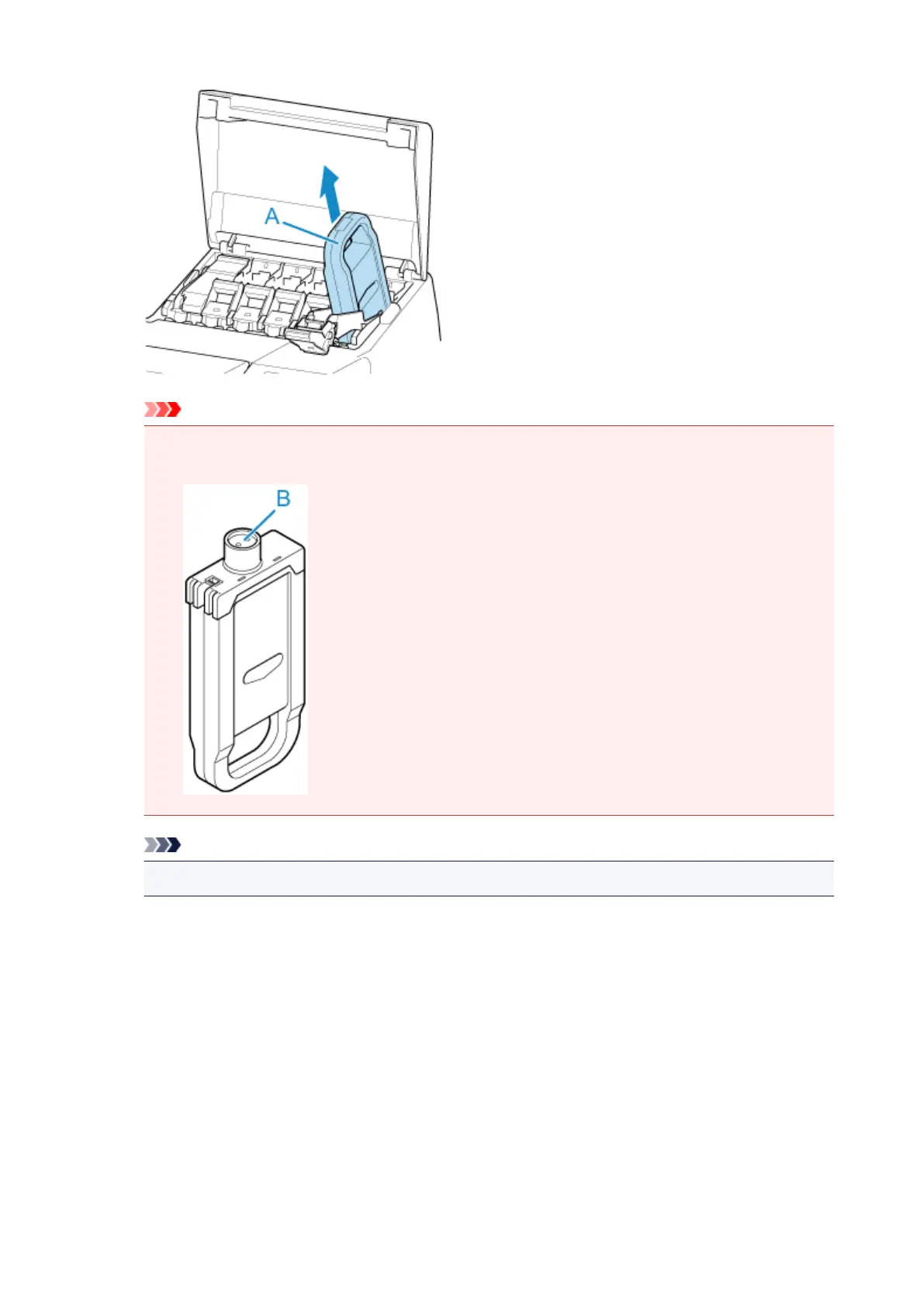 Store the removed ink tank with ink remaining in the box with the ink holes (B) facing up.