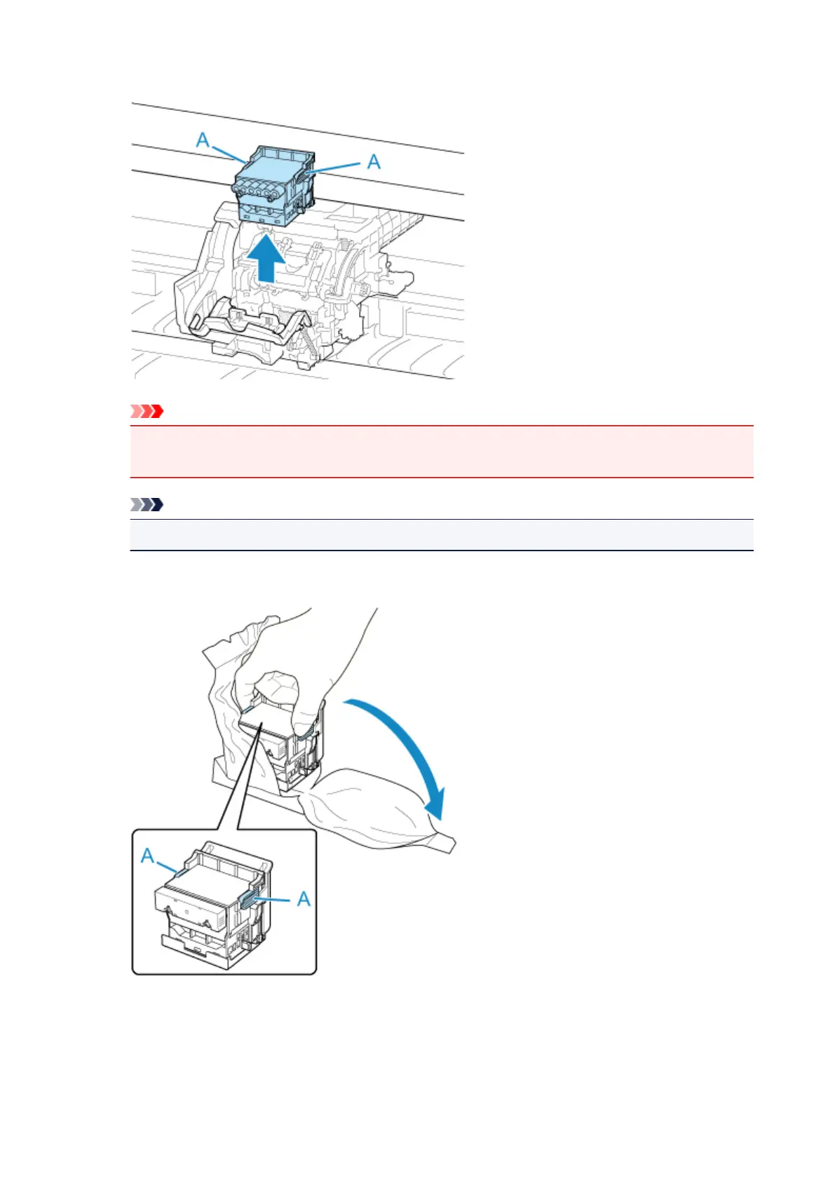 Take new print head out of its pouch by grabbing grips (A).