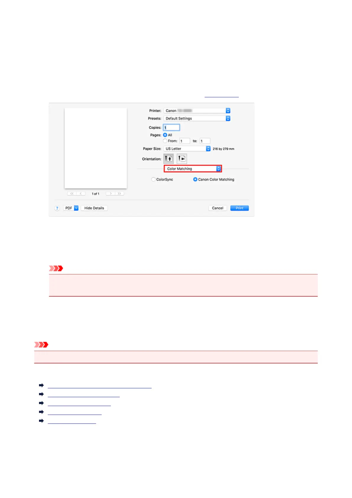 1. Select Color Matching from the pop-up menu of the Print Dialog