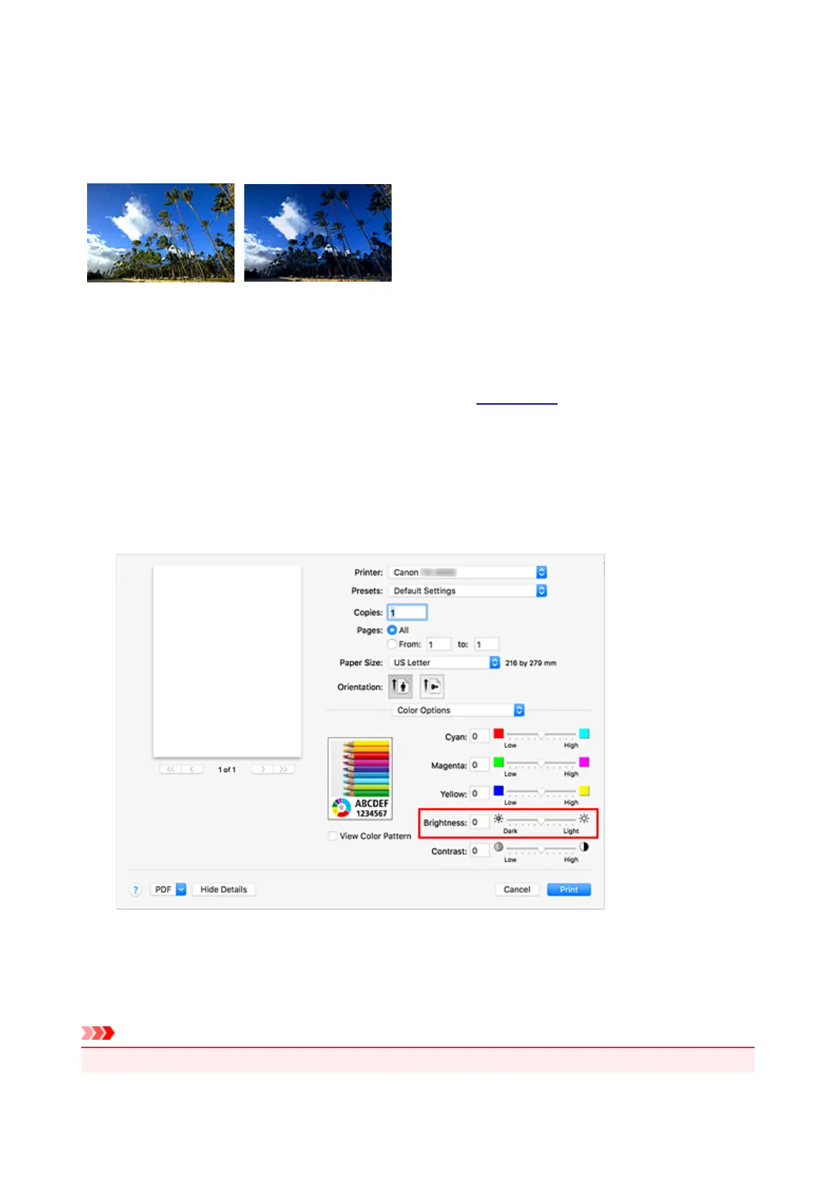 Moving the Brightness slider to the right brightens the colors, and moving the slider to the left darkens