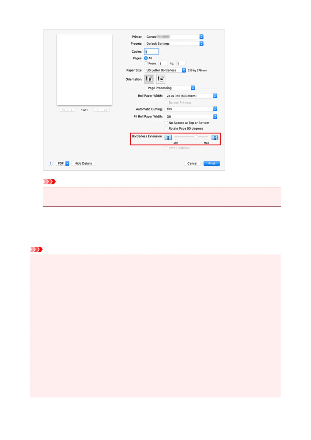 • If the Borderless Extension slide bar is set to the far right position, the back of the paper may