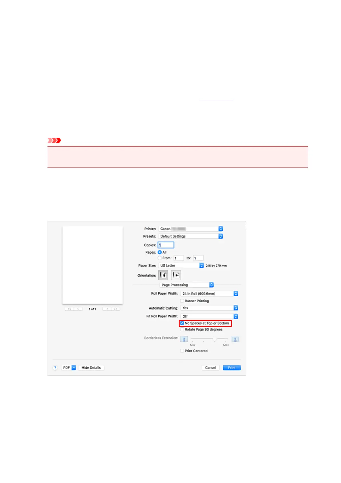 When printing on roll paper, you can save paper by reducing the upper and lower margins when printing.