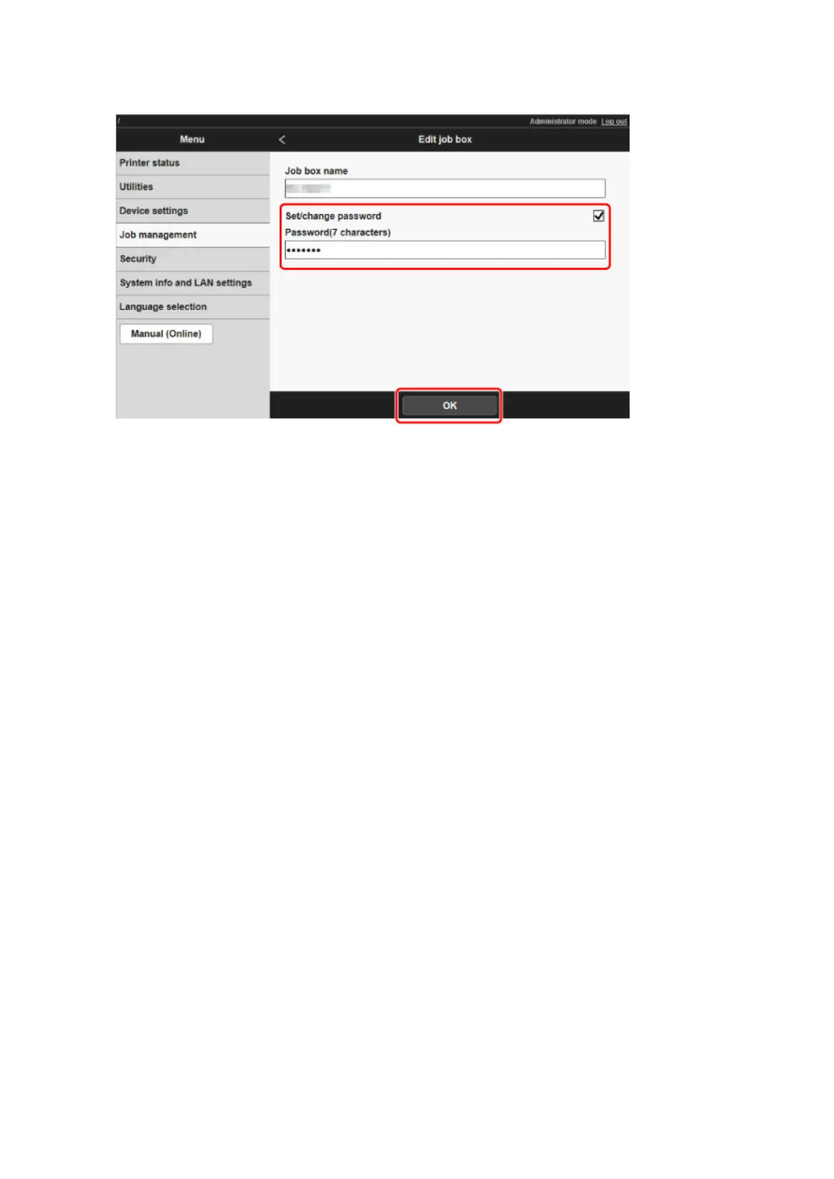 6. In Edit job box dialog box, specify password.