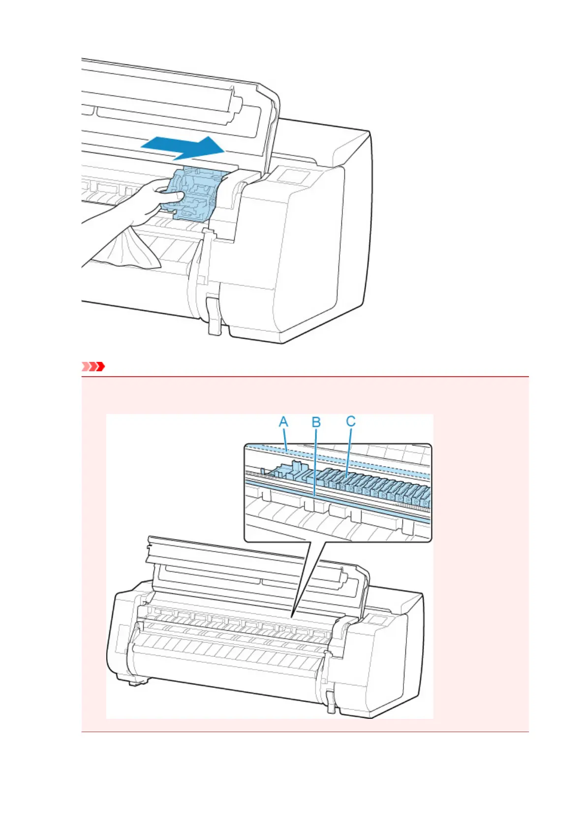 Do not touch the linear scale (A), carriage shaft (B), or ink tube stabilizer (C). Touching these may