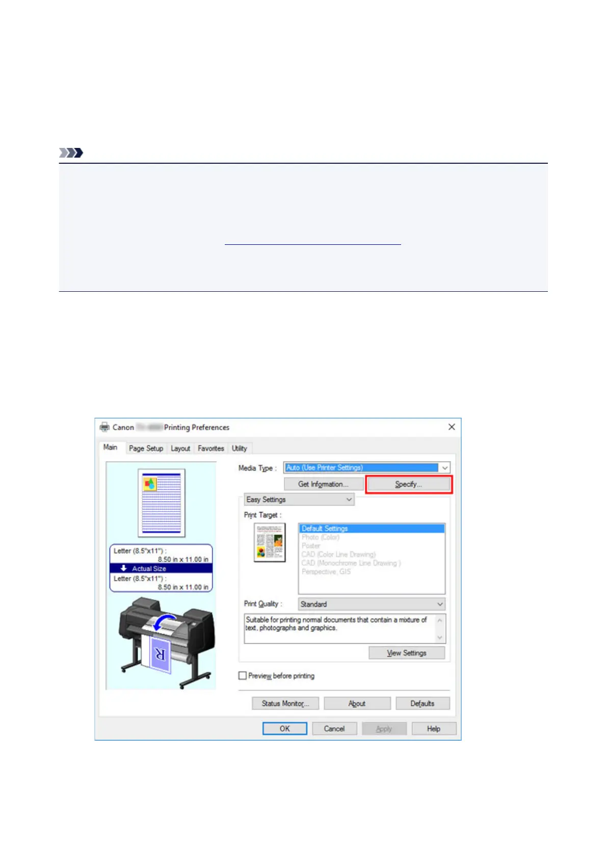 Select Main sheet and click Specify... for Media Type.