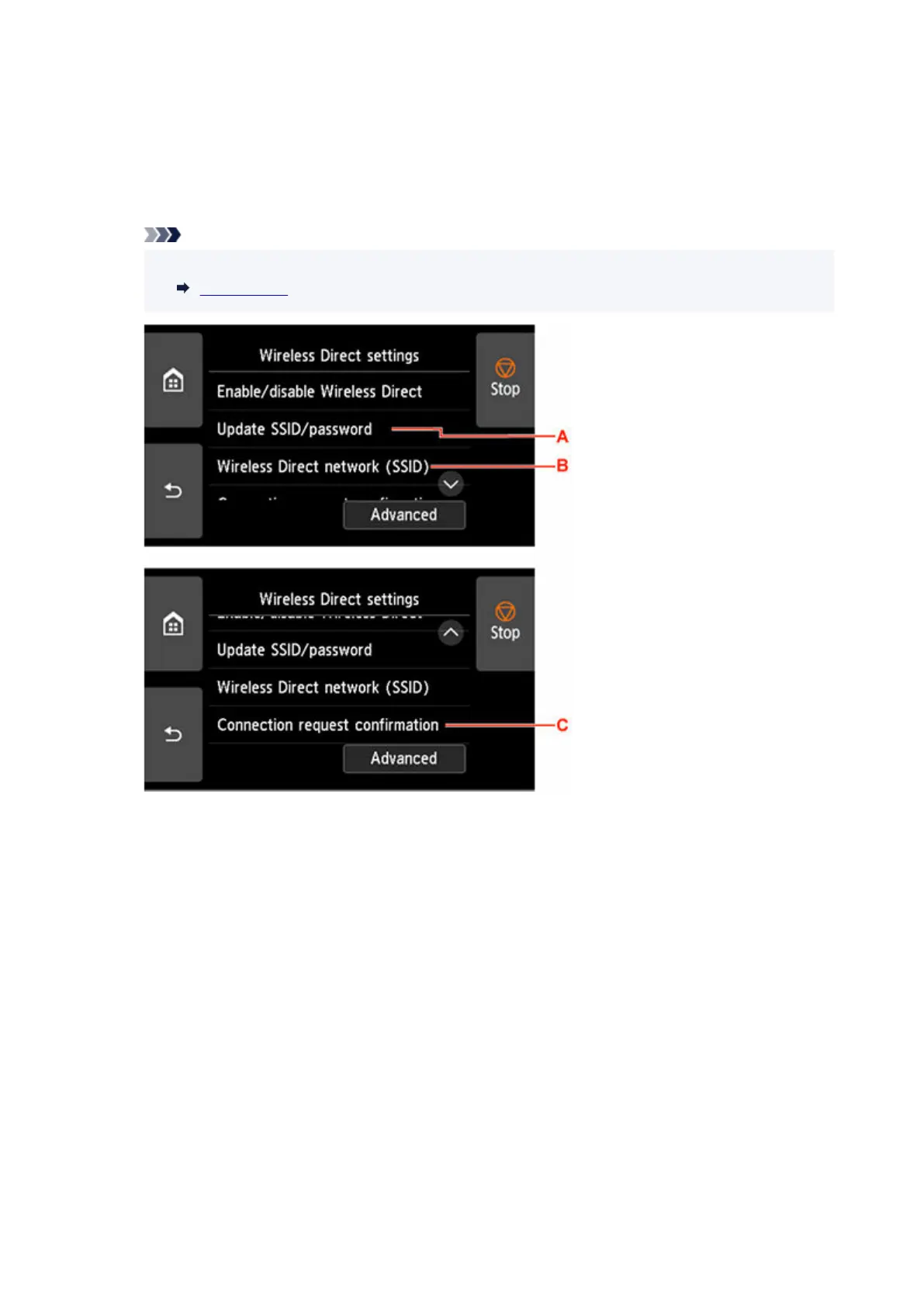 Tap B to display the printer's name (device name) displayed on a Wi-Fi Direct compatible