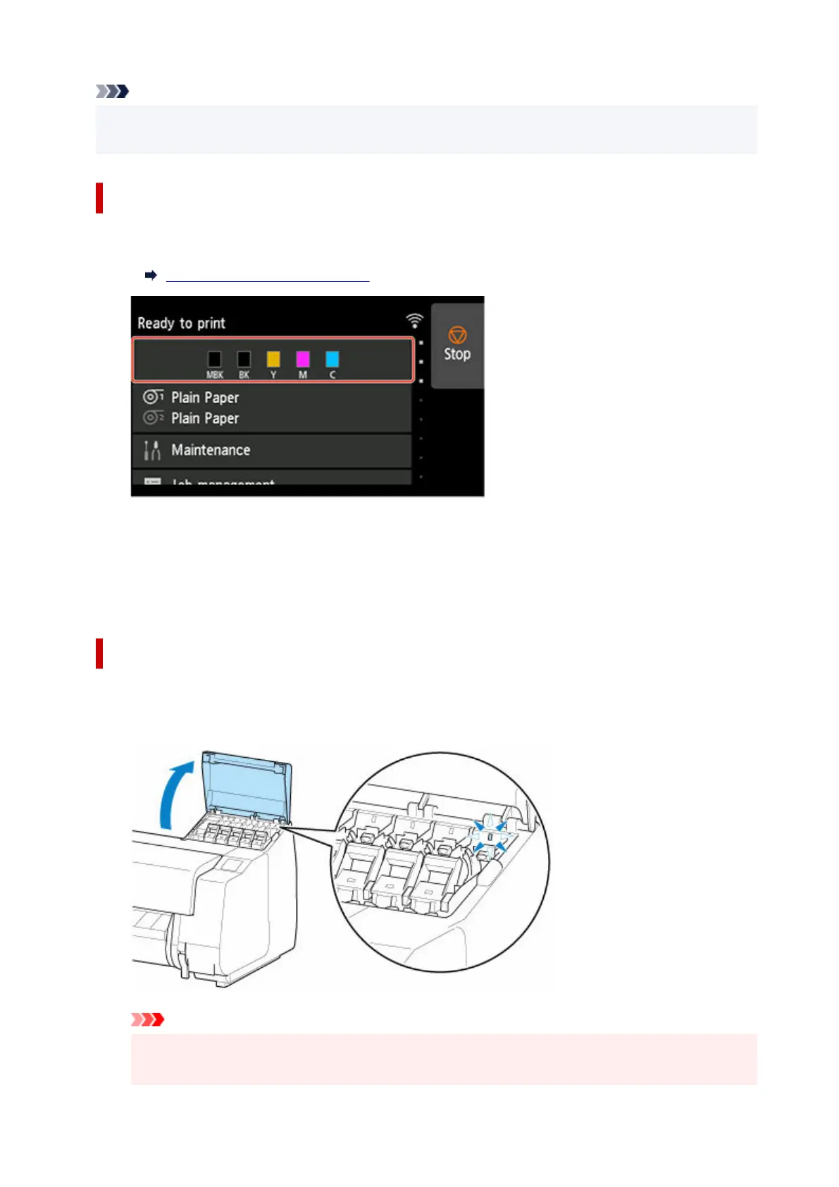 • Ink tank replacement is possible even during printing, when print jobs are being canceled, or when