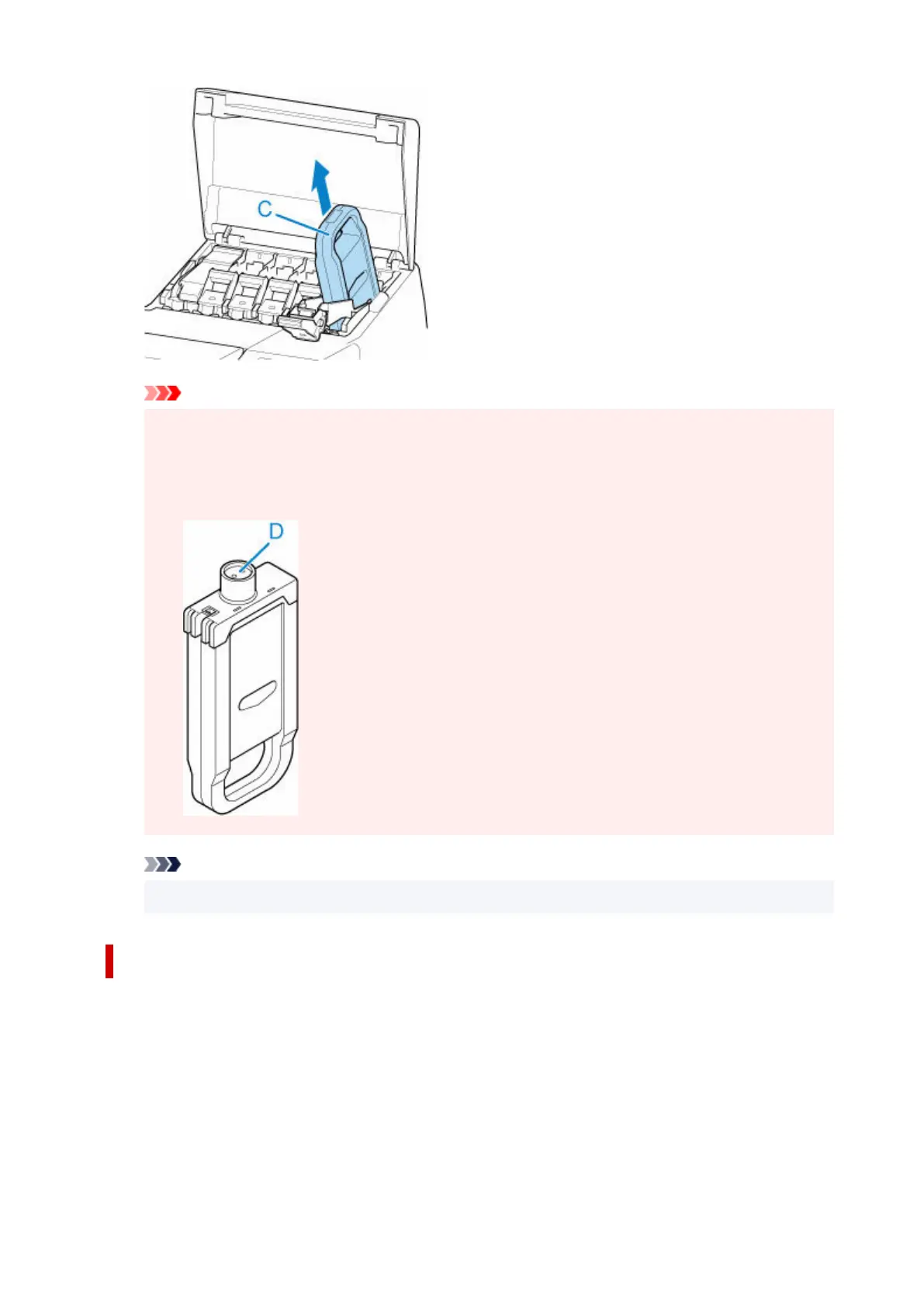 • Store the removed ink tank with ink remaining in the box with the ink holes (D) facing up.•