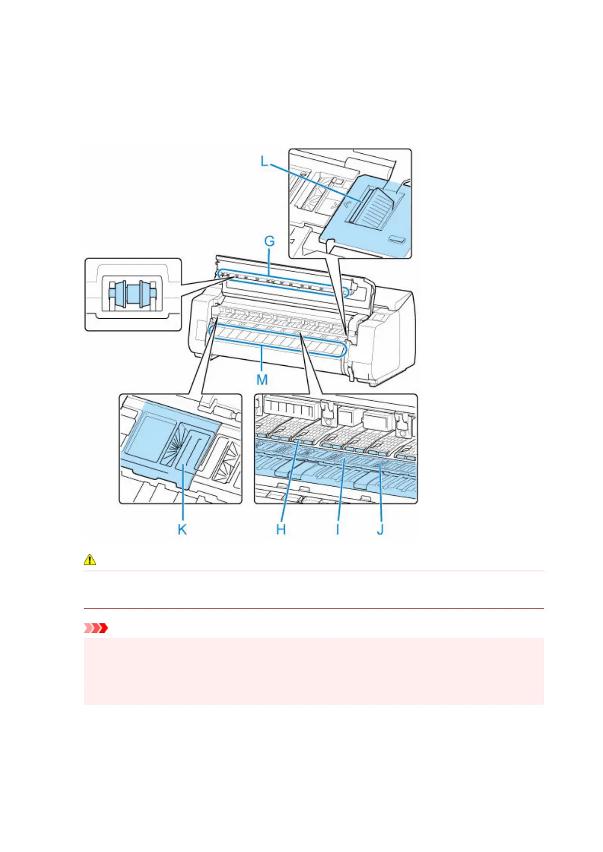 Wipe away any ink residue and paper dust (debris from cutting) on top cover roller (G), paper retainer