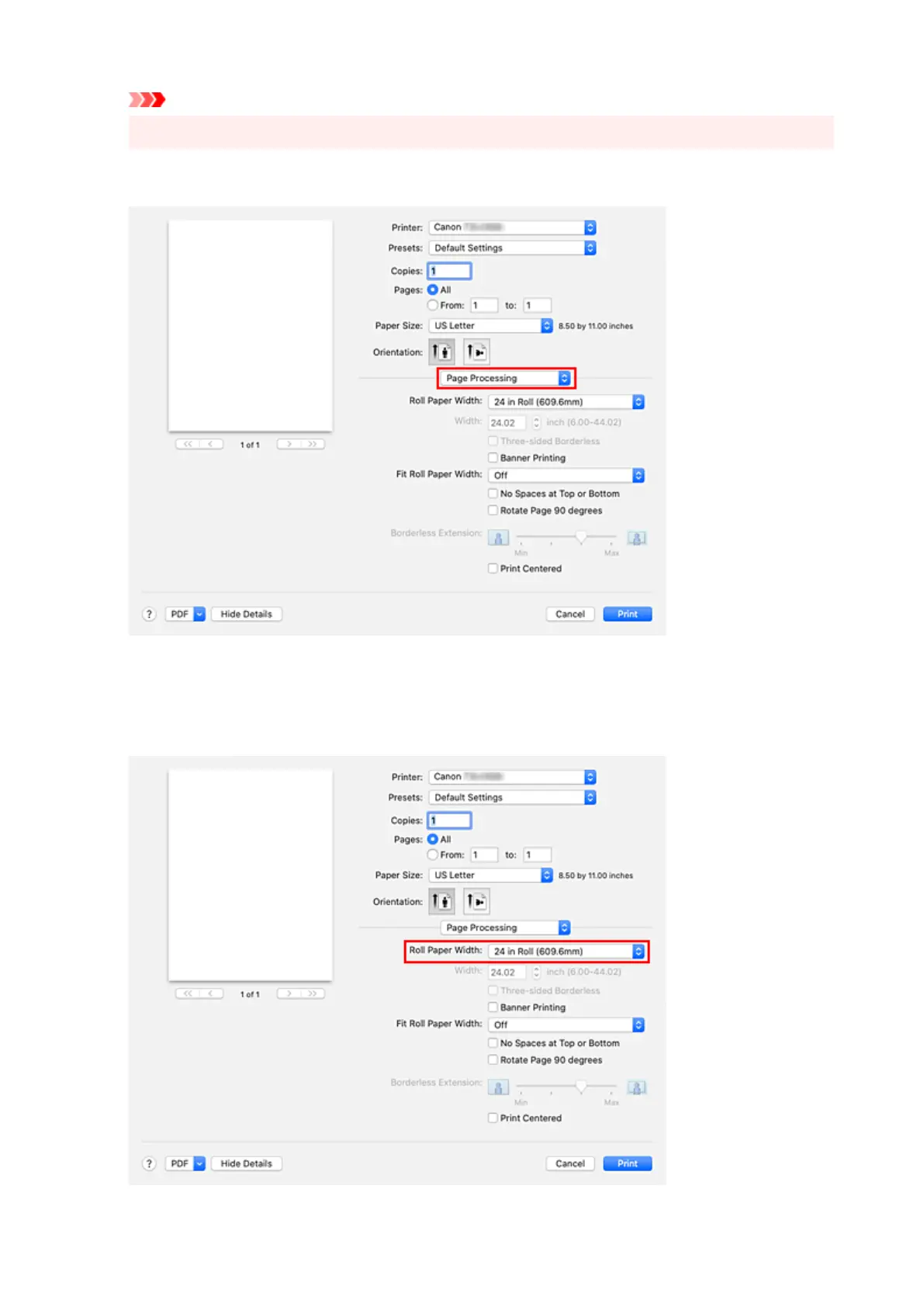 If you selected a roll paper for Paper Source in Quality & Media, set Roll Paper Width to the width of