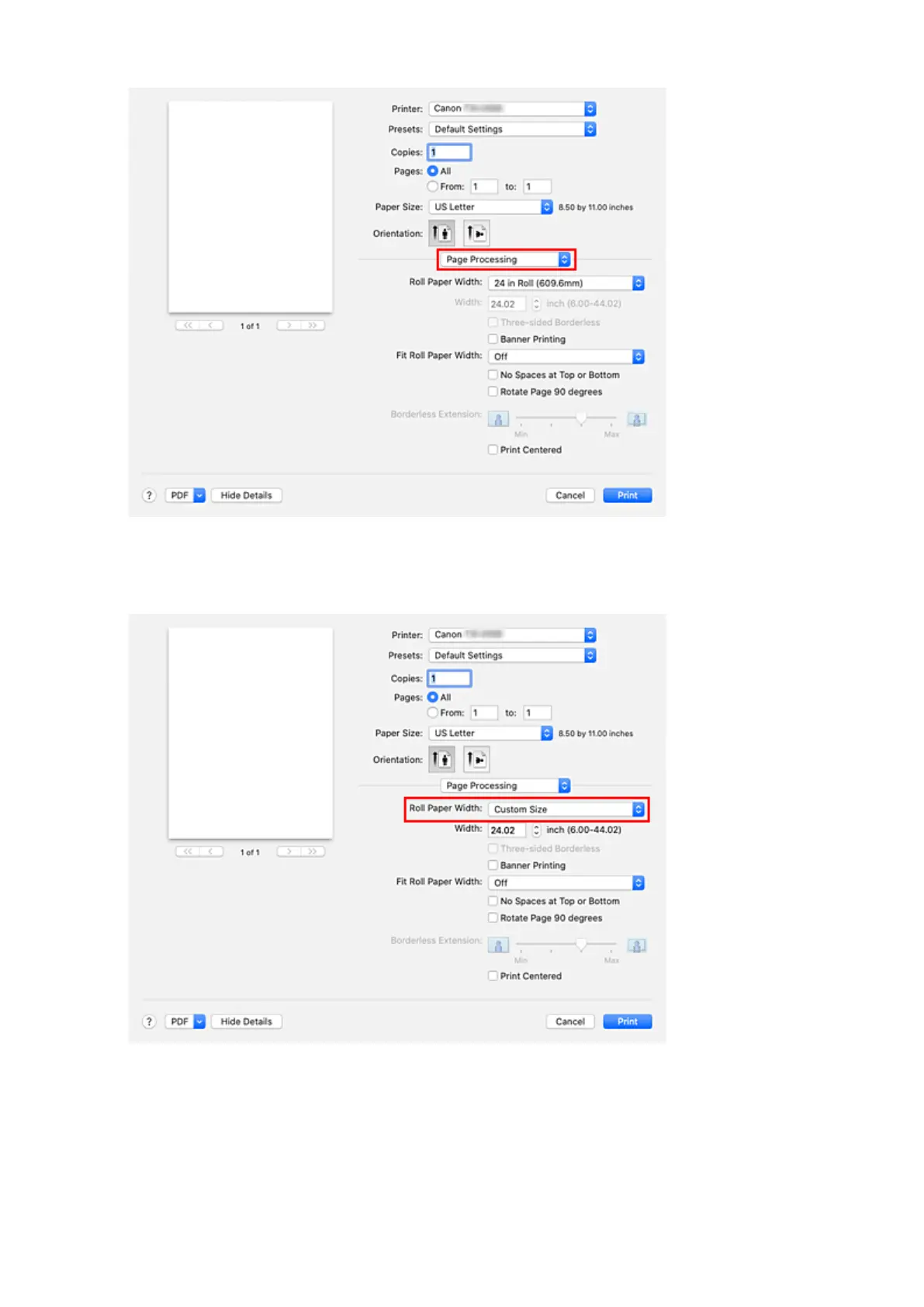 Select Custom Size for Roll Paper Width.