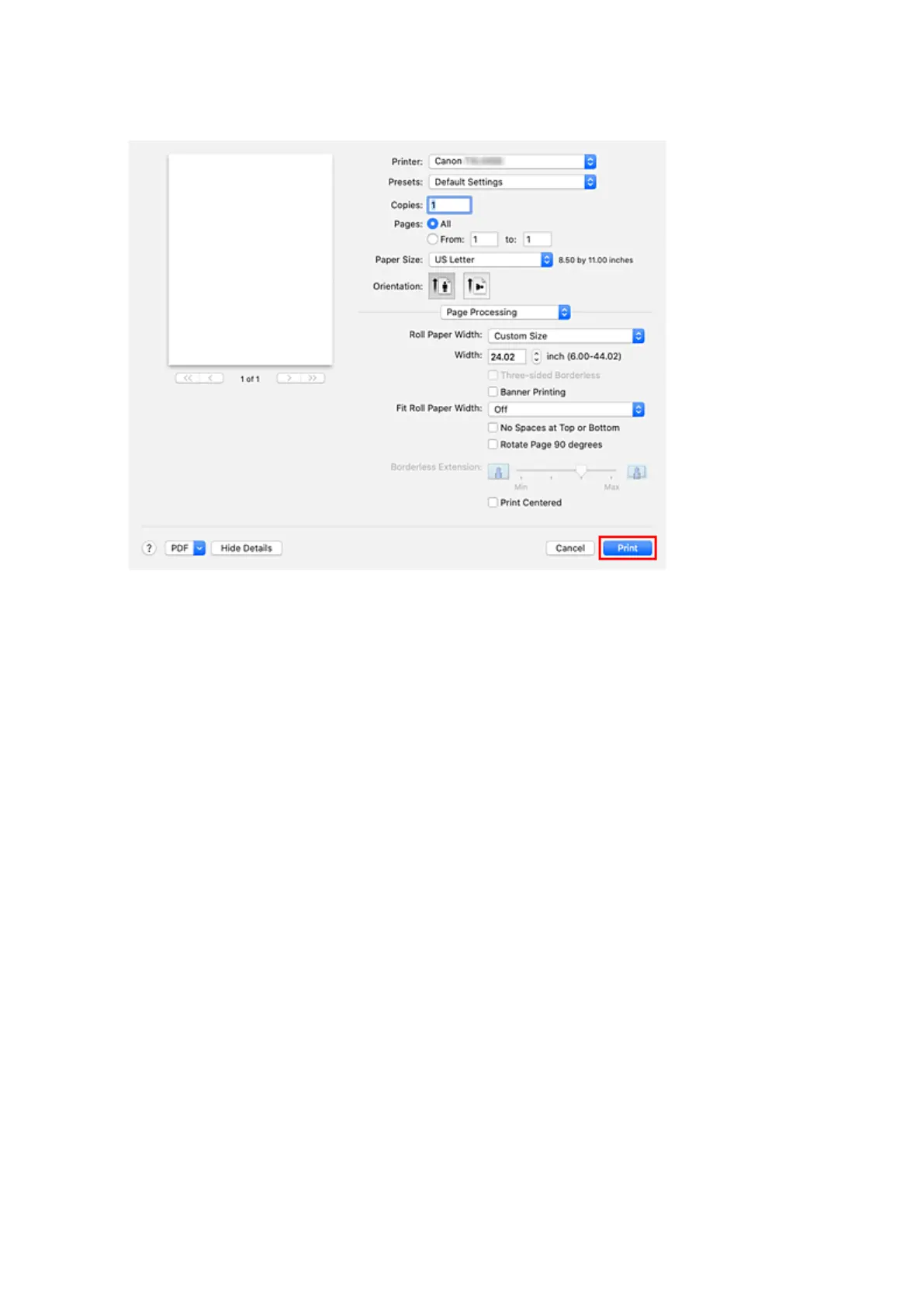 If you perform the print, the roll paper with the specified width will be used for printing.