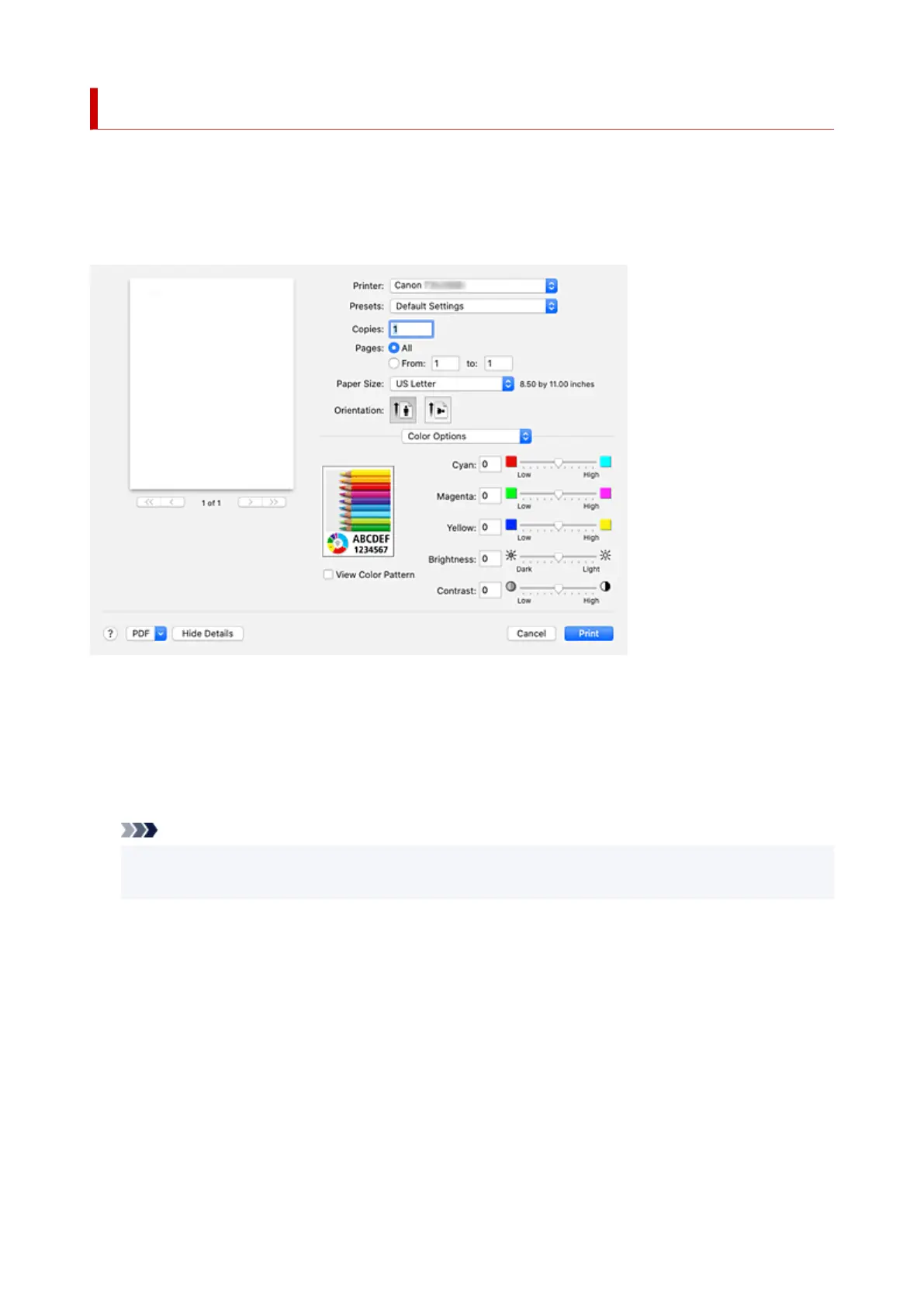 This dialog allows you to adjust the print color as you like. If the color of the printed image is not as