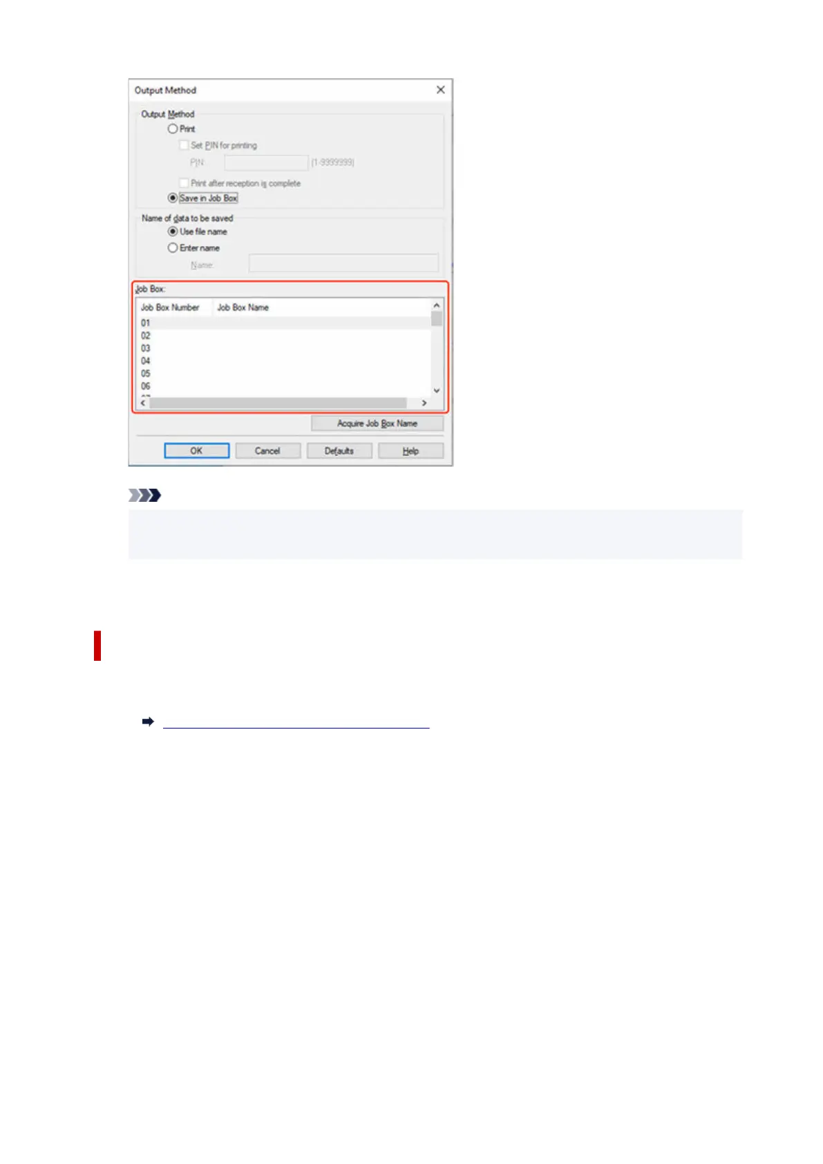 • Select Acquire Job Box Name to display personal job box names in the Job Box list, as