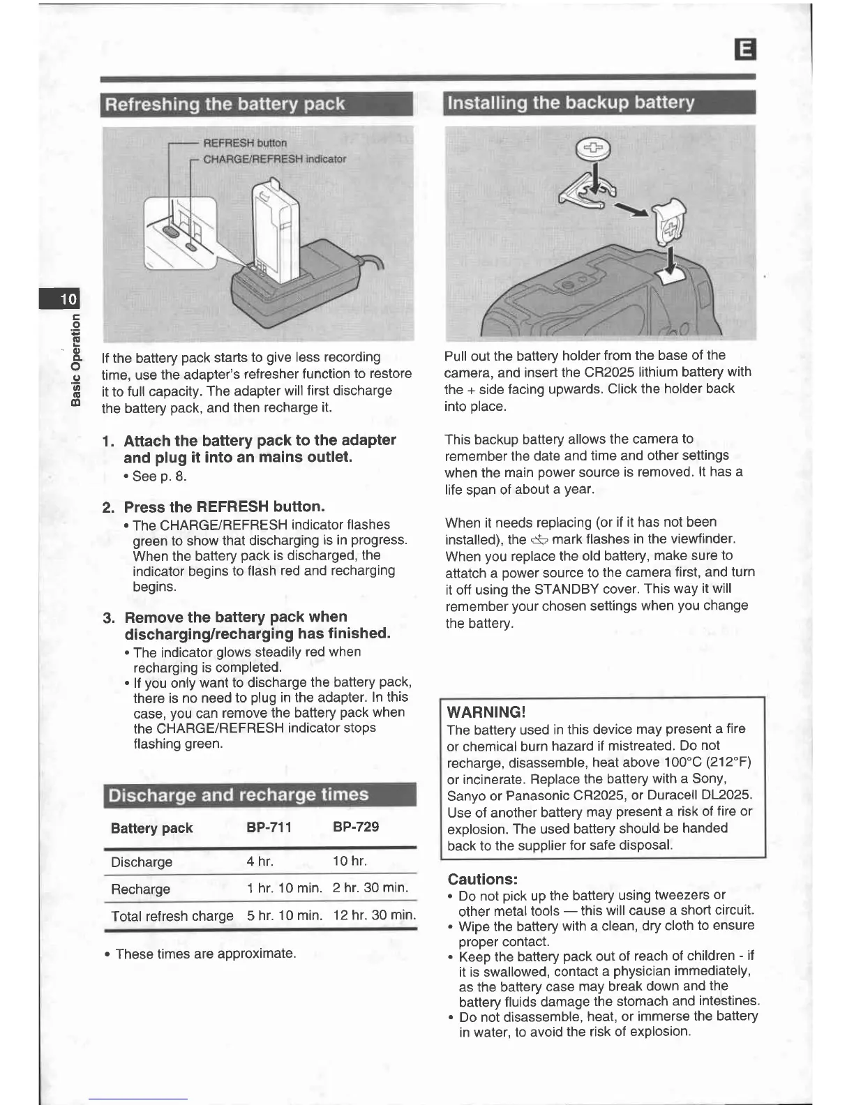 Canon UC 900 - Refreshing the Battery Pack; Discharge and Recharge Times; Installing the Backup Battery