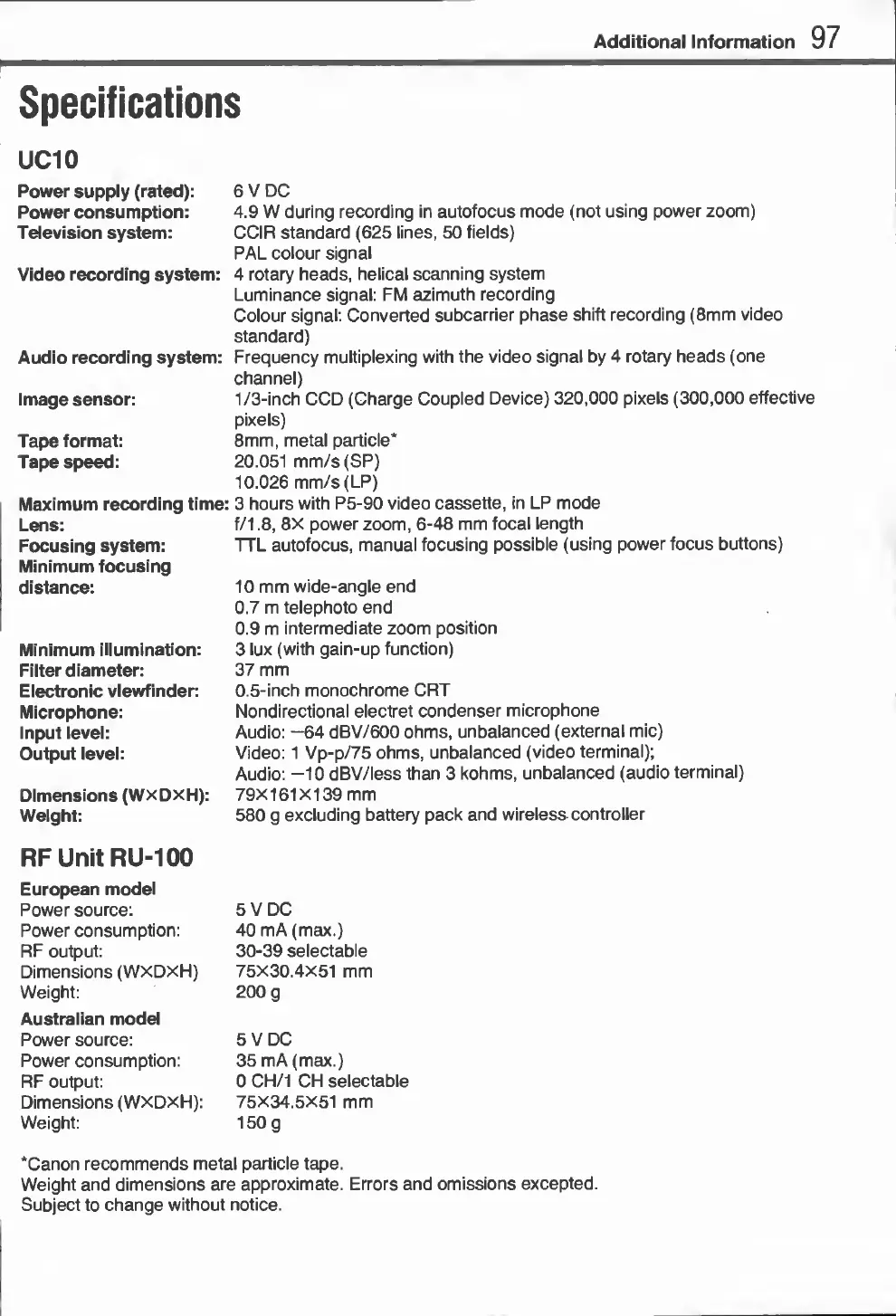 Canon UC10 - Specifications.97